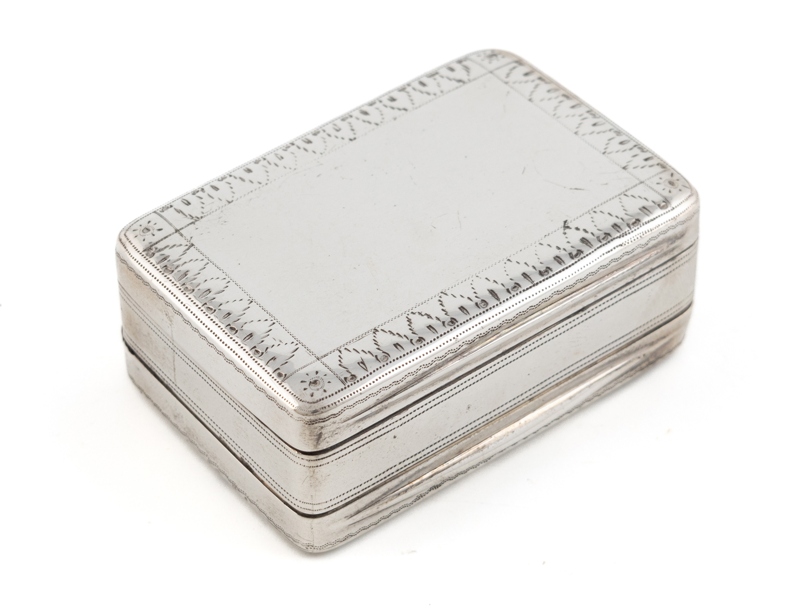 rectangular form, engraved borders, hinged base, the interior with a steel grater, length 5.8cm, approx. weight 2.5 oz.