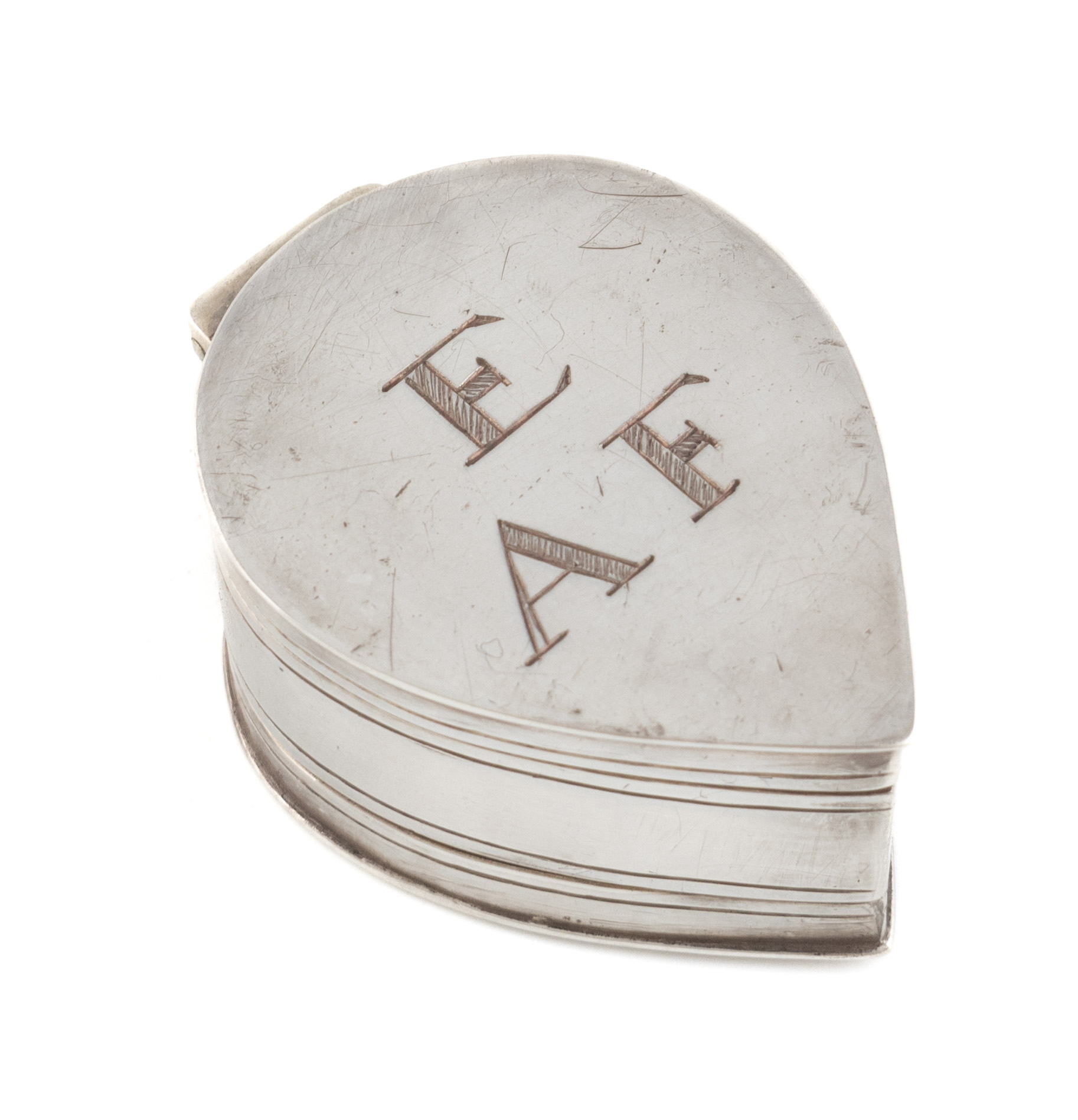 tear-drop form, the hinged cover engraved with a simple tulip, engraved border, hinged base, scratch initialled 'E' over 'A.F', the interior with a grater, length 4.5cm, approx. weight 1oz.