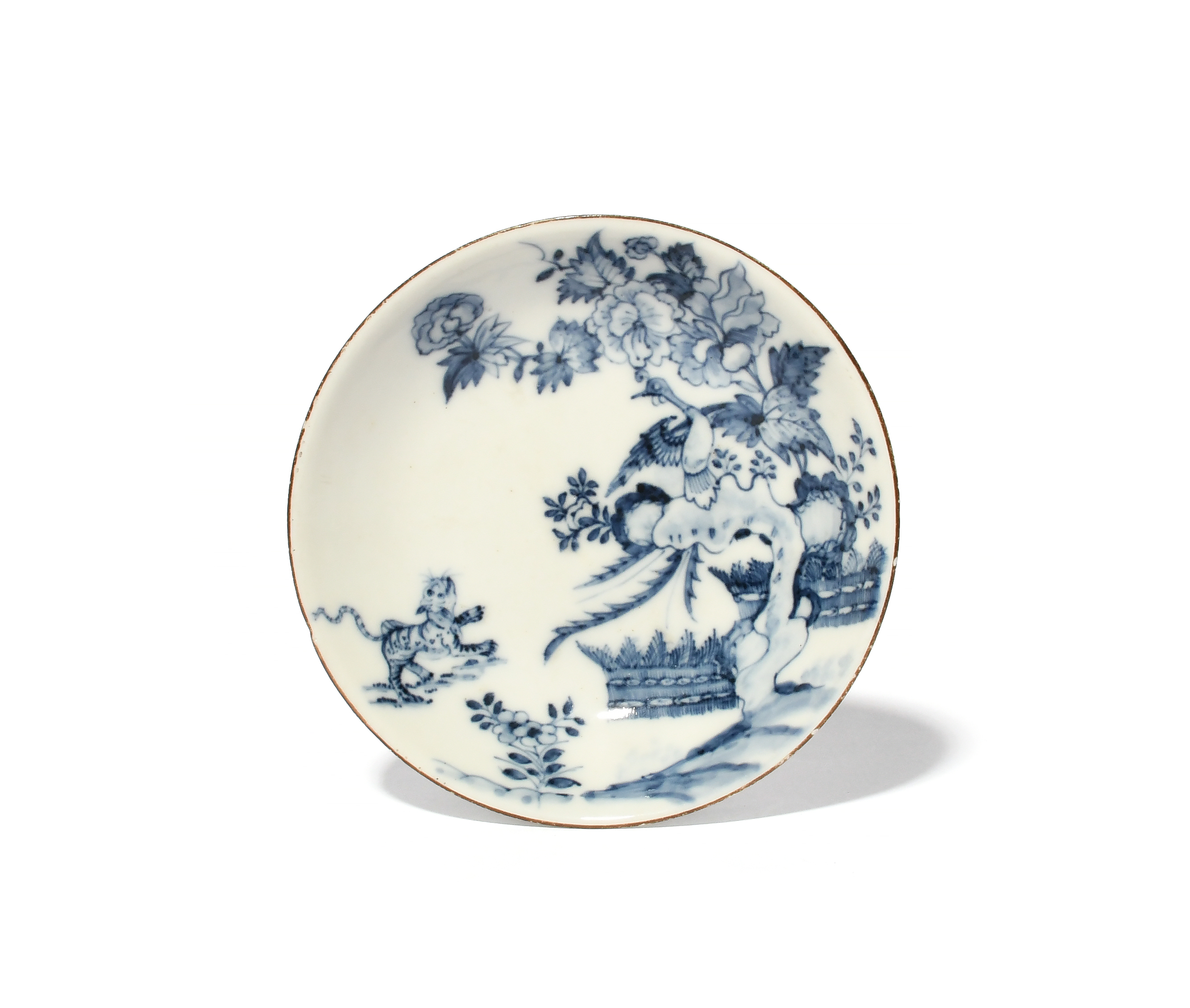 A rare Meissen blue and white saucer, c.1730, painted with a playful tiger running towards a long-tailed phoenix perched on flowering branches above banded hedges, brown line rim, blue crossed swords mark, impressed 54, 13.2cm.