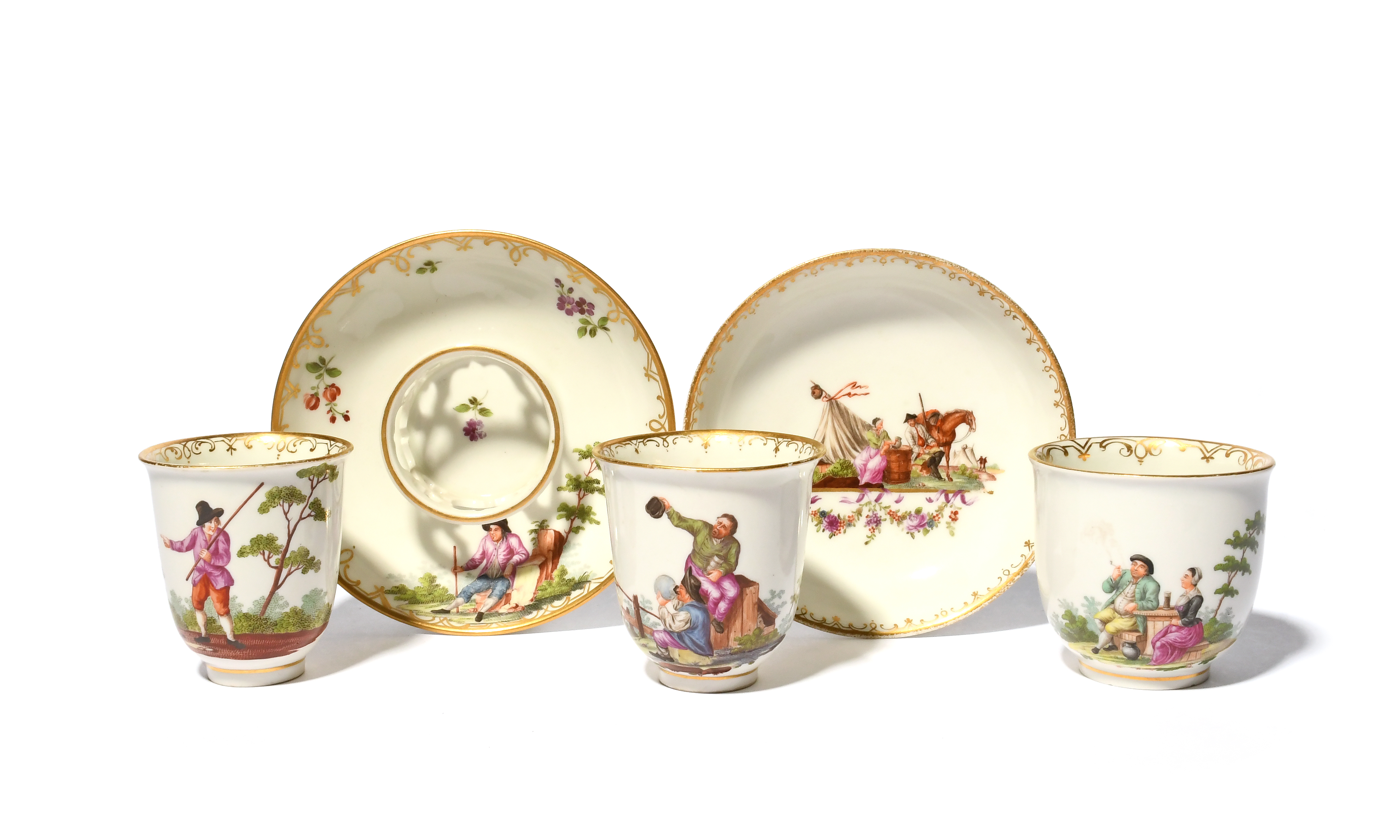 Three Vienna chocolate or coffee cups and two saucers, c.1760-70, painted by or in the manner of Andreas Oettner with pastoral figures at various pursuits, one saucer with a woman entertaining a soldier dismounted from his horse, the other with a traveller seated on rocks, the well with a pierced trembleuse gallery, one cup unusually painted with two topers carousing on a pig crate and calling for more ale, all within formal gilt scroll borders, blue shield marks, some impressed marks, 13.5cm max. (5)