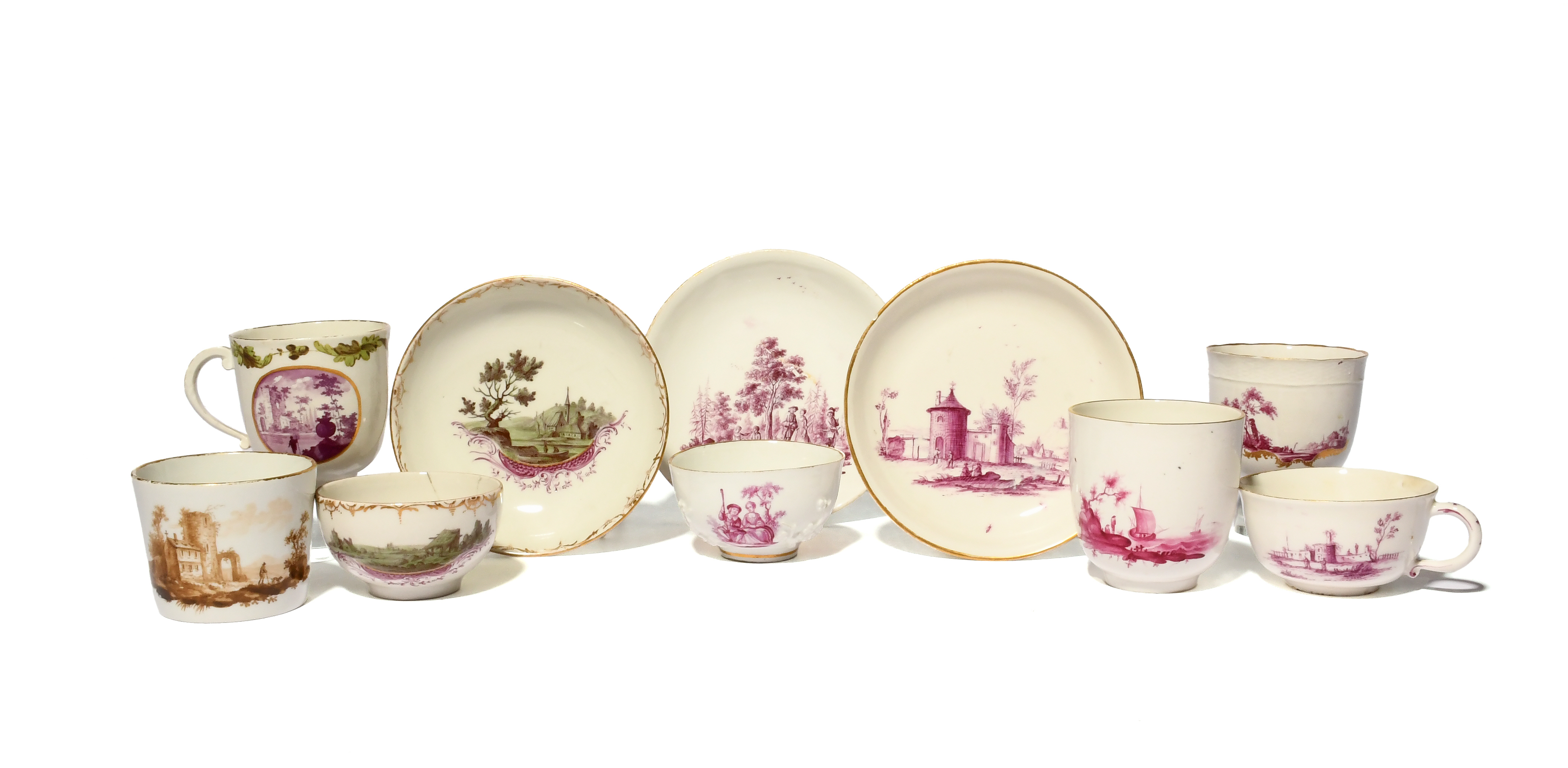 A group of German porcelain tea wares, c.750-80, variously painted in purpurmalerei and other monochrome decoration, including a Frankenthal teacup and saucer, a Höchst teacup and saucer, a Höchst coffee cup, all with figures in landscapes, a Meissen teabowl painted with courting figures among applied prunus, a similarly decoration Meissen saucer, an Ansbach flared cup with a sepia landscape, a coffee cup attributed to Ottweiler, and a Kloster-Veilsdorf coffee cup with landscape panels, various marks, some damages, 13.3cm max. (10)