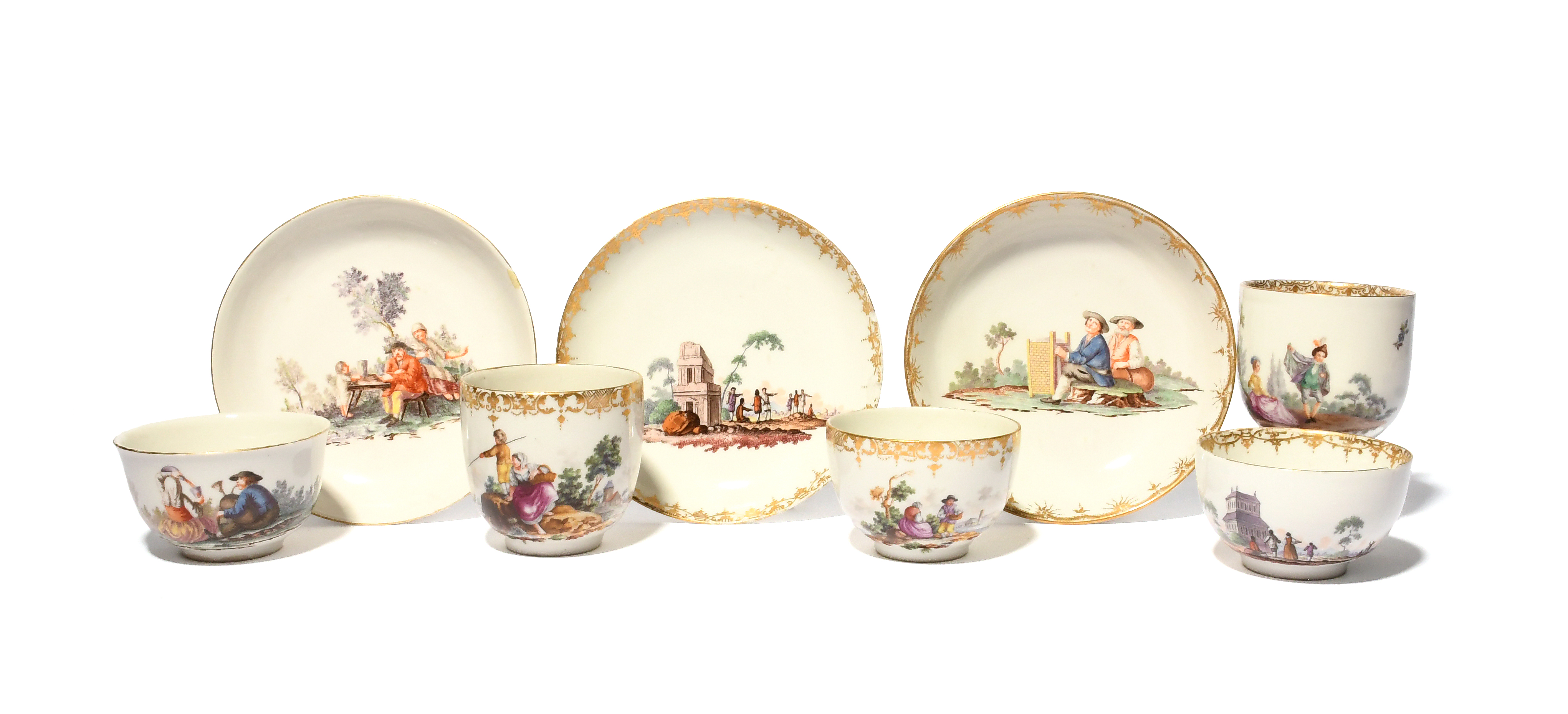 A group of German porcelain teawares, c.1760-70, including a Nymphenburg cup and saucer, painted with Dutch style peasant scenes of figures pouring wine and seated at a table, a Nymphenburg saucer painted by Joseph Kaltner with two men seated beside a fruit press, a Furstenberg teacup and saucer painted by Andreas Oettner with figures before buildings and ruins, a Furstenberg coffee cup painted with a couple in woodland, and a teacup and coffee cup from the same service painted with peasant figures including a child fishing from a bank, 13.5cm max. (8)