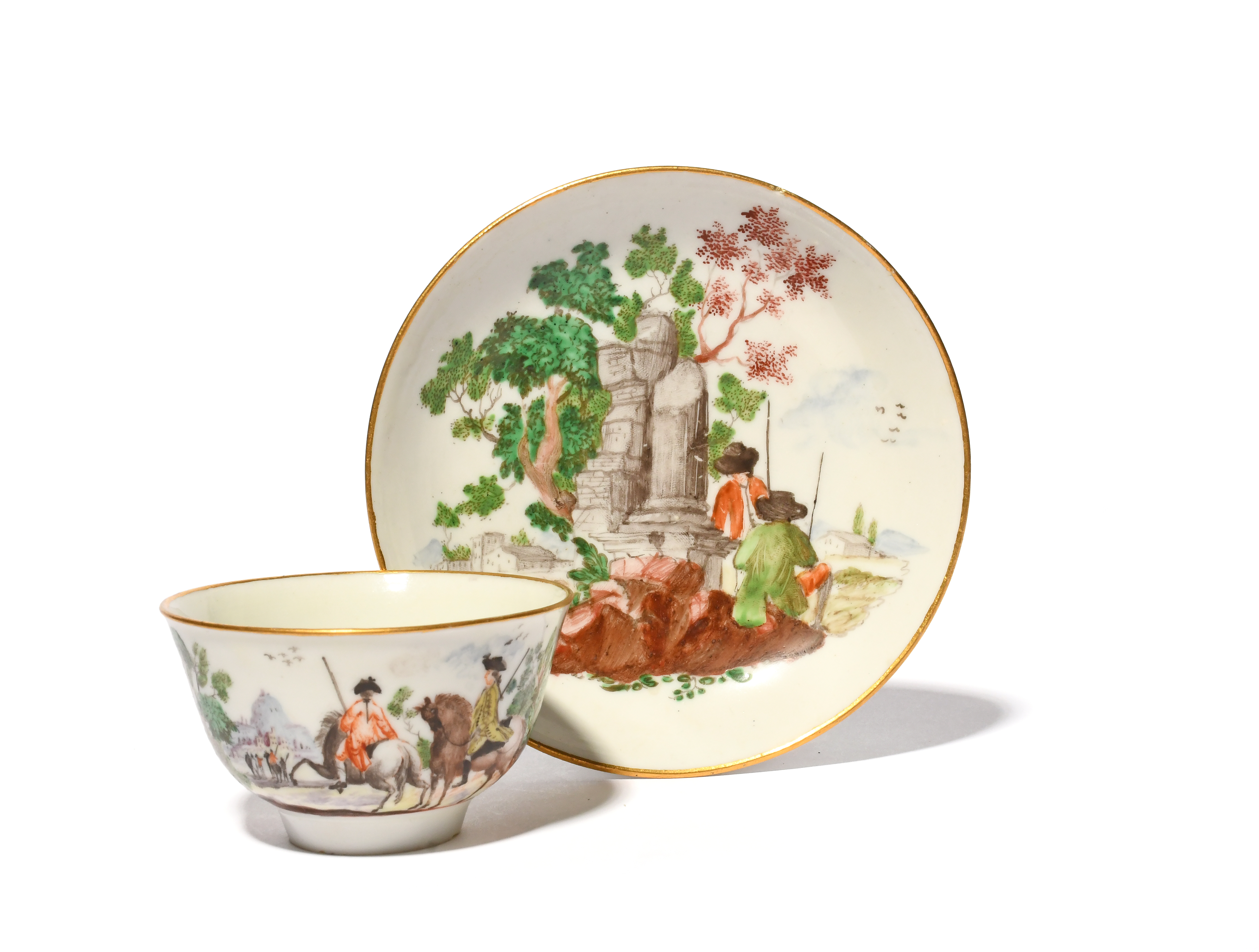 A Nove teabowl and saucer, c.1790, painted perhaps by Giovanni Marcon, the teabowl with two soldiers on horseback riding into a distant town in a continuous landscape, the saucer with two figures seated beside Classical ruins, red star marks, incised X to the saucer, 11.7cm. (2)