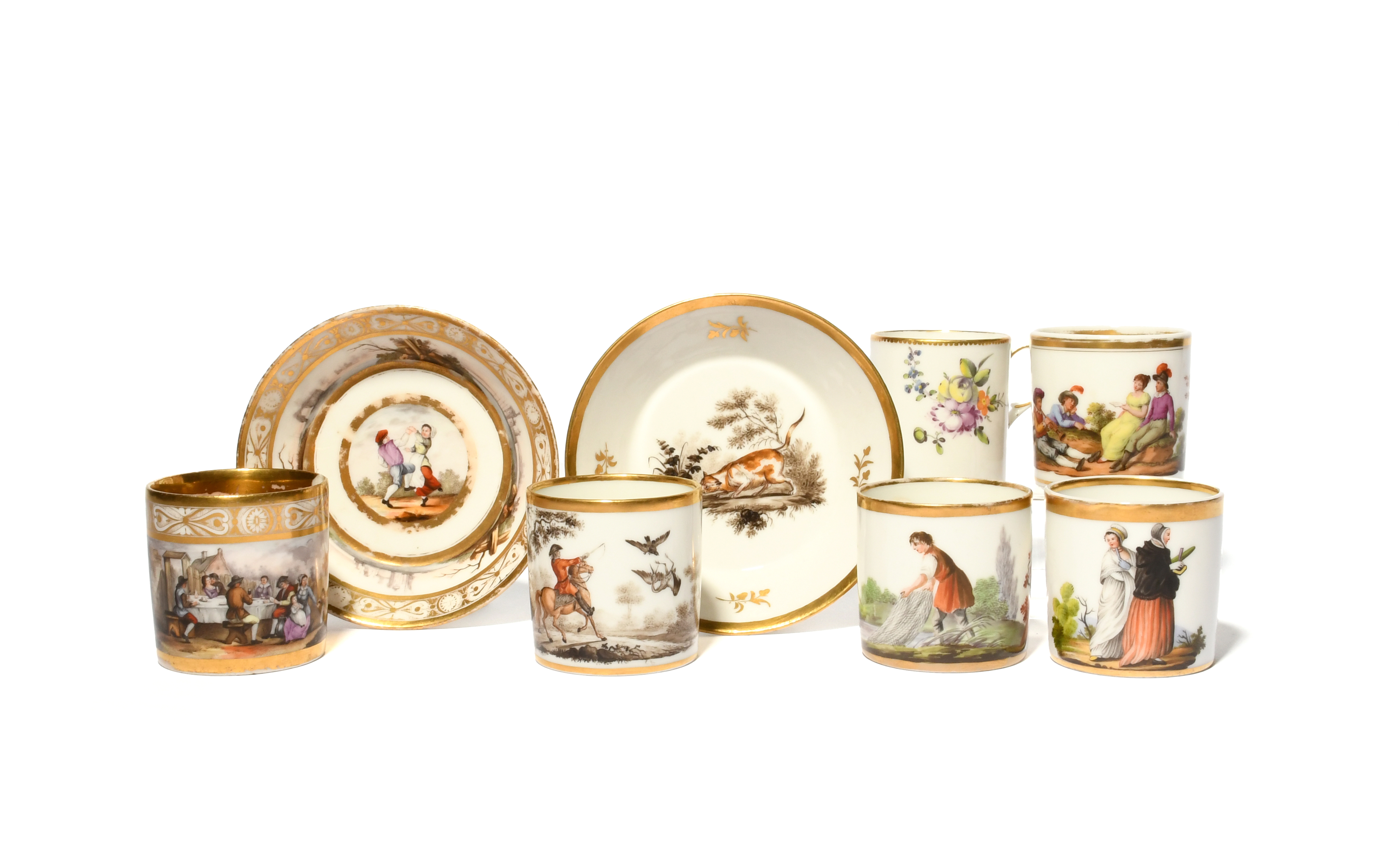 A Chevalier Brothers (Paris) coffee can and saucer, c.1793-99, the can painted with revellers around a table, the saucer with a couple dancing, a Paris porcelain can painted with a fisherman, another with two ladies, another with four figures at rest in a garden, another with a figure on horseback, a Boisettes coffee can painted with flowers, and a Paris saucer painted with a cat sniffing a bush, 13cm max. (8)