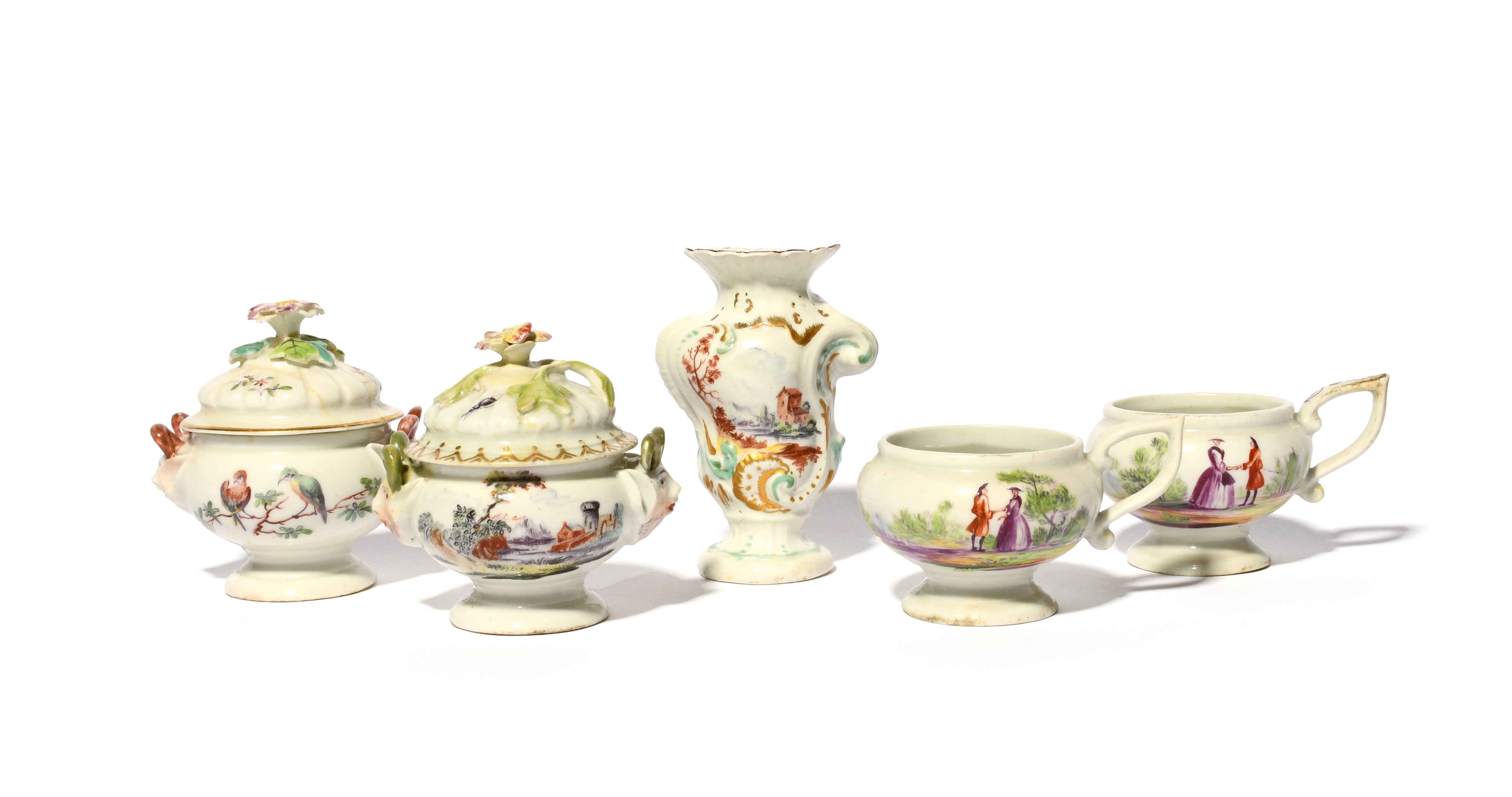 Two small Derby pots and covers, c.1760, applied with mythical mask handles and painted with birds, landscapes and flowers, a pair of footed pots with wishbone handles, painted with couples, and a miniature rococo scroll vase painted with a landscape and a large butterfly, some damages and repairs, 8.8cm max. (7)