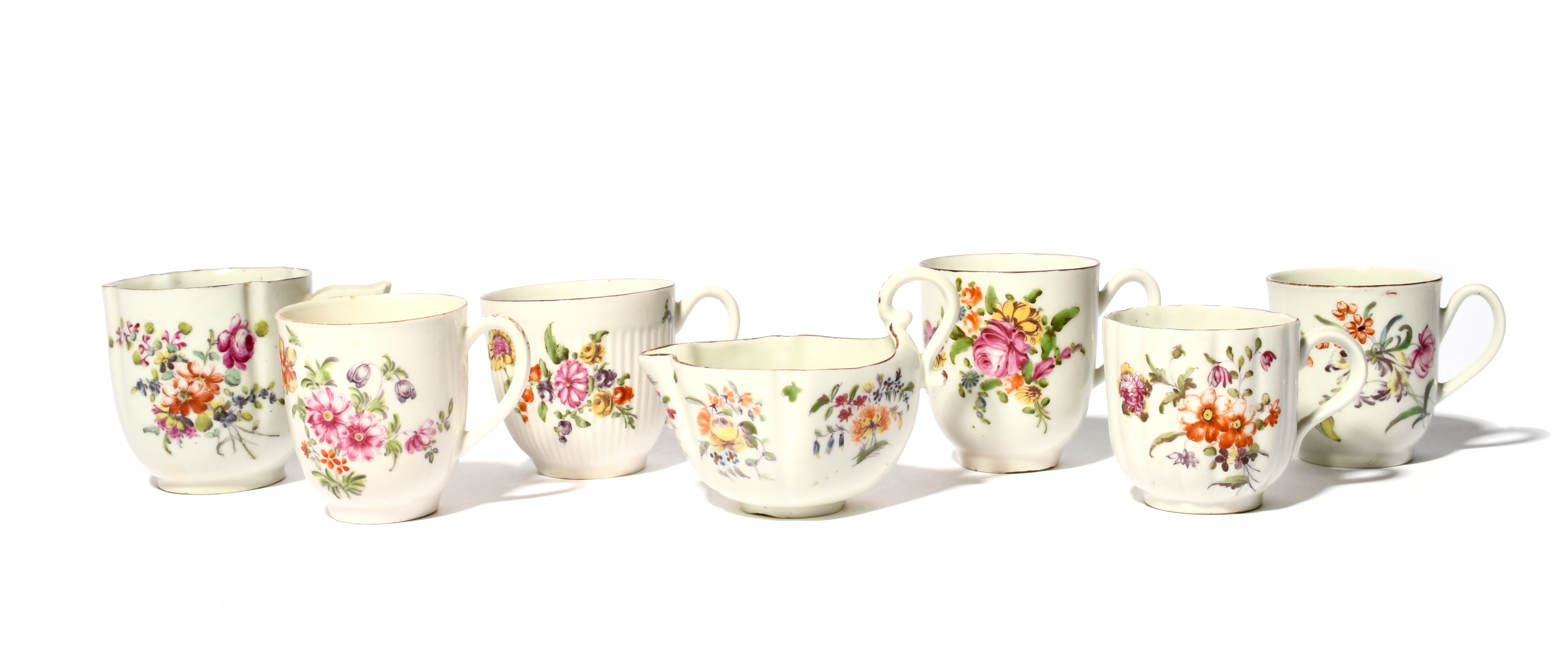 Six Derby coffee cups, c.1760-65, the largest of quatrefoil form with wishbone handle, one fluted, another with a band of reeding, all variously decorated with flowers, and a small Derby sauceboat or creamer, similarly decorated, puce line rims, small faults, 7cm high max. (7)