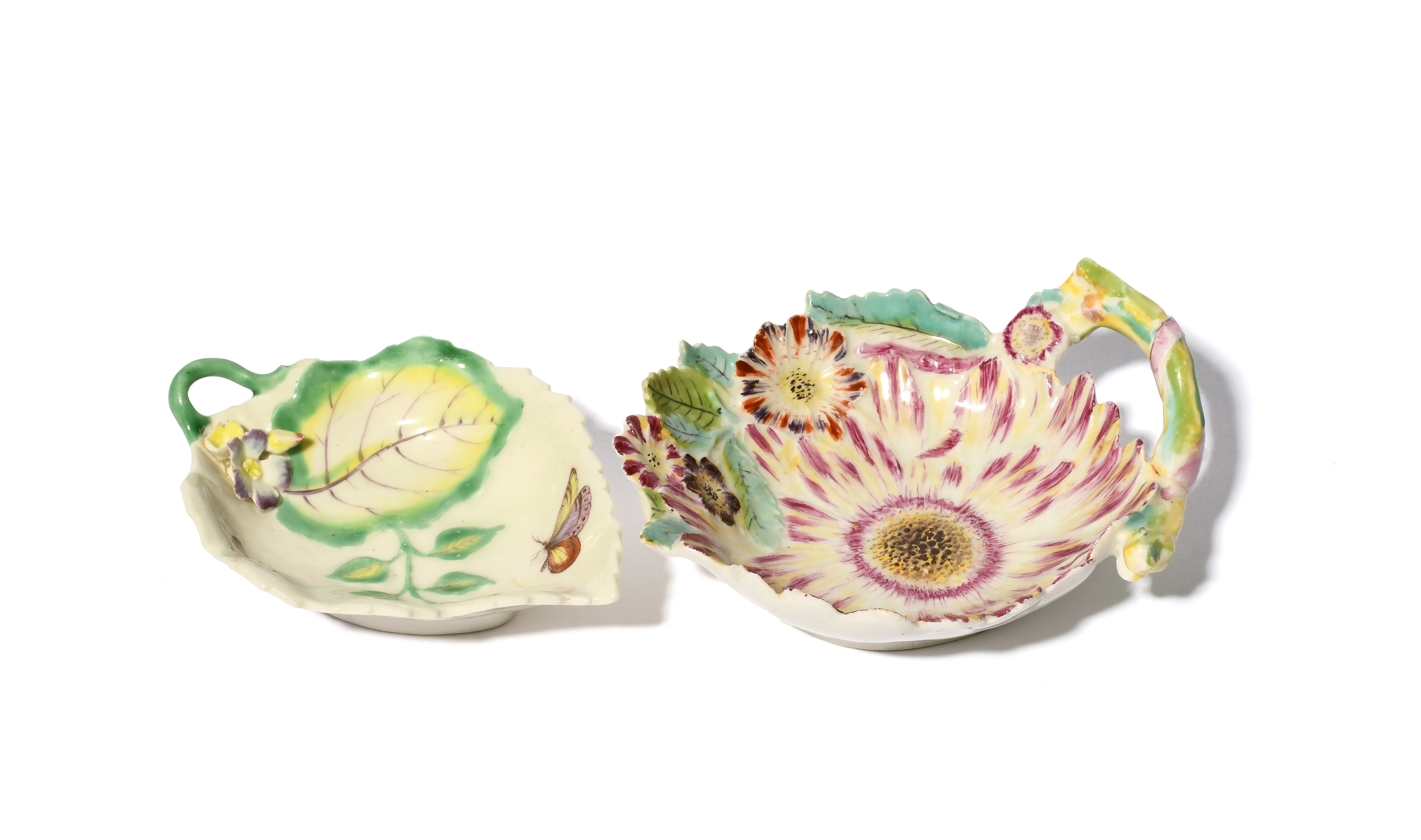 A small and rare Derby sunflower dish, c.1755, modelled as a large flower edged on one side with further flowers and leaves, and a small Longton Hall leaf dish, moulded with further leaves and painted with a moth and other flying insects, the handle of the first dish broken and restuck, 12.5cm max. (2)
