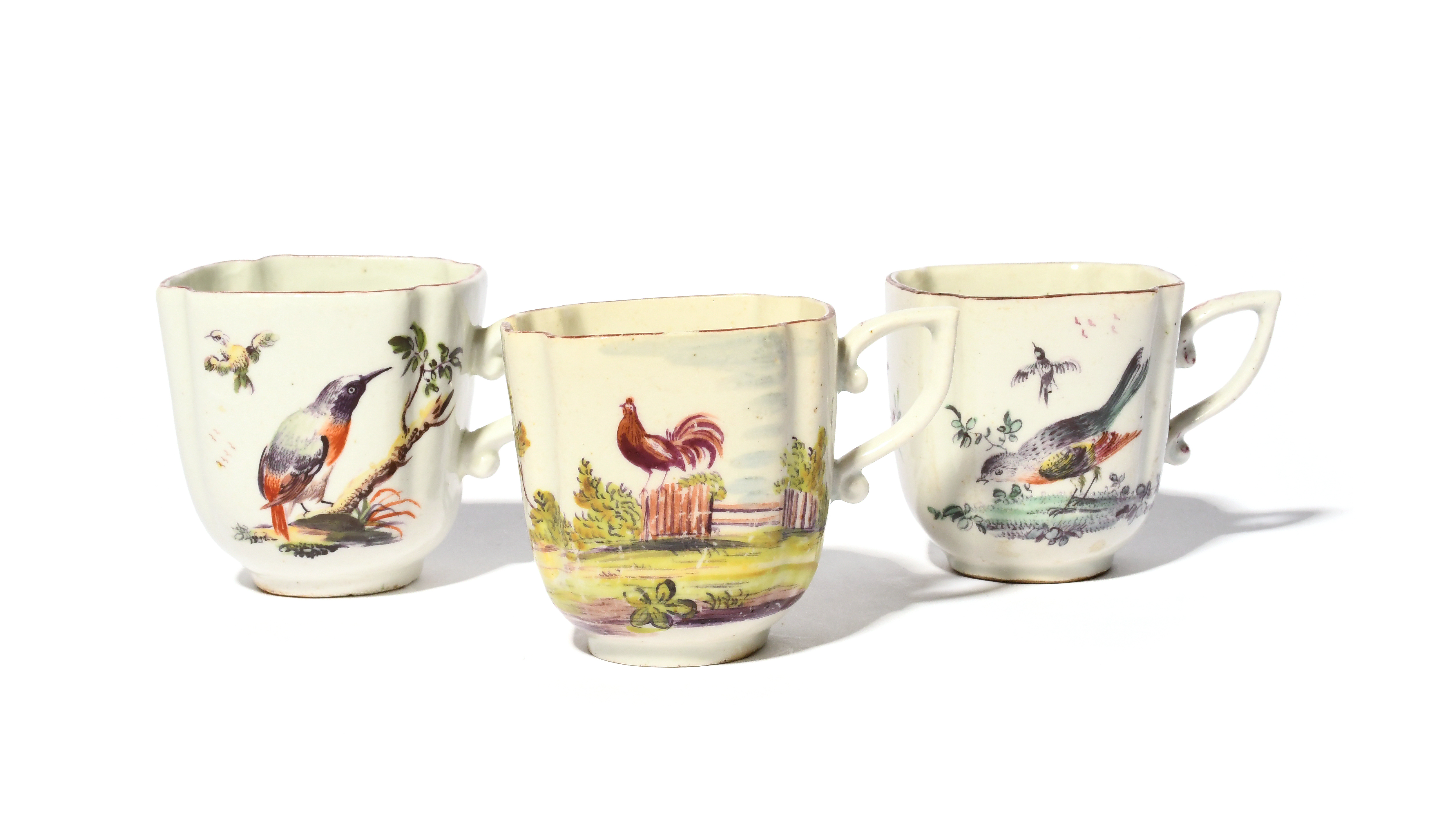 Three Derby coffee cups, c.1756, of square section with canted corners, one painted with a cockerel and hen, the others with birds perched on the ground or low branches beside others in flight, two reverses with flower sprays, one with a large butterfly, brown line rims, with wishbone handles, one cracked, 6cm high. (3)