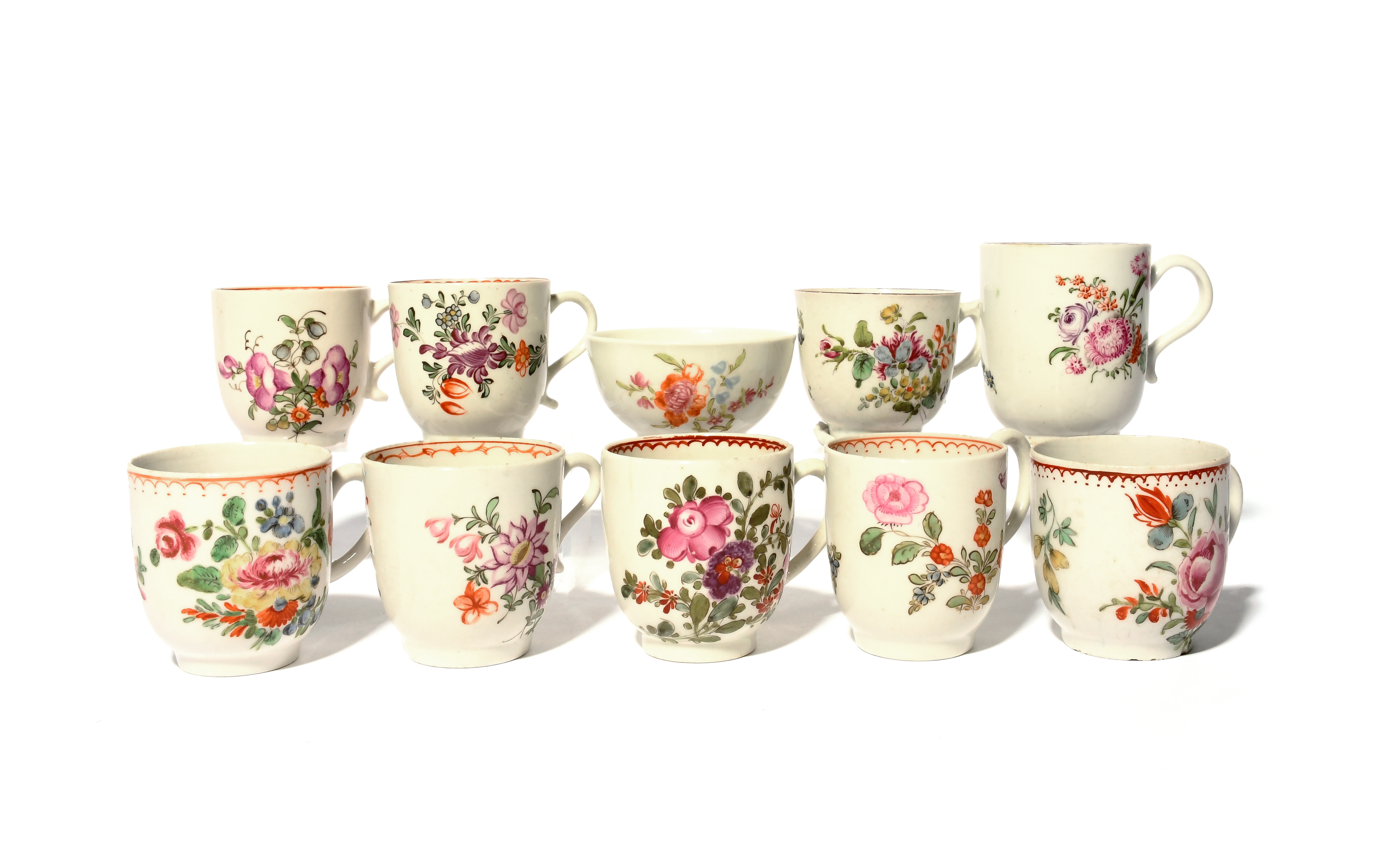 A group of English porcelain cups, c.1760-70, comprising nine coffee cups and a teabowl, mostly Bow and Lowestoft, one coffee cup Longton Hall, all variously decorated with polychrome flower sprays, seven with iron red crowsfoot borders, 7cm max. (10)