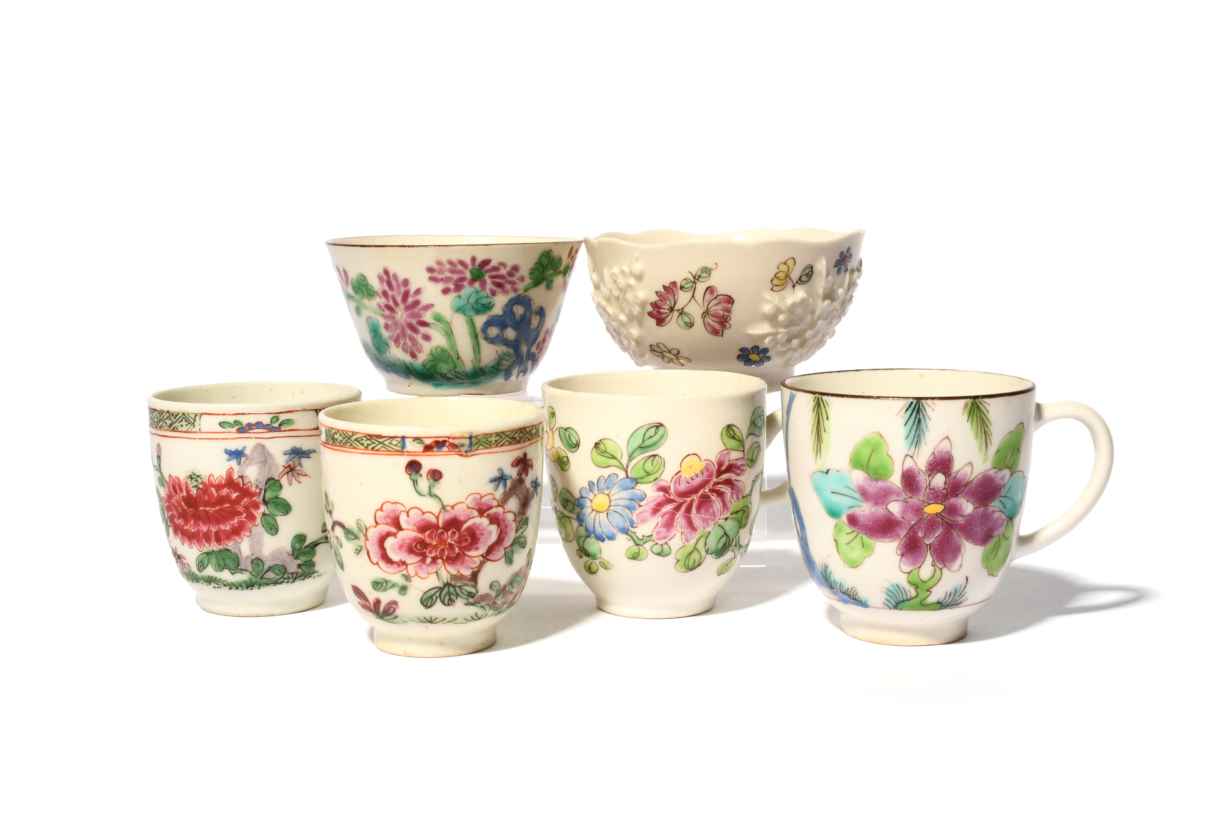 Four early Bow coffee cups and two teabowls, c.1753-55, the cups variously decorated in famille rose enamels with flowering peony and chrysanthemum plants, one teabowl applied with prunus and painted with scattered flowers, the other painted with flowering plants, rockwork and two black birds, some faults, 6.2cm max. (6)