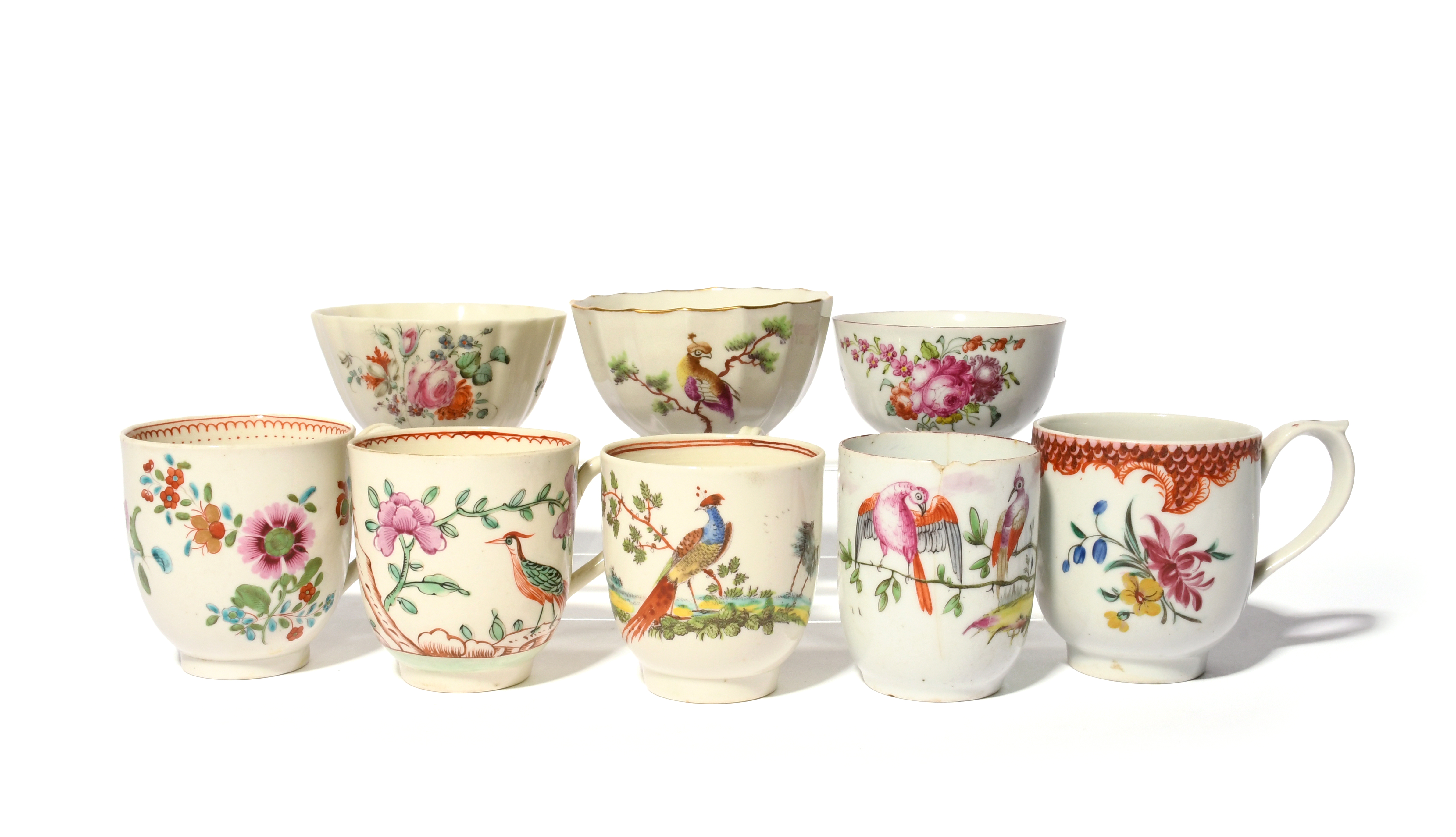 A group of English porcelain tea and coffee wares, c.1755-80, including a Longton Hall teabowl painted with flowers, a Longton Hall coffee cup painted with colourful birds, two Liverpool coffee cups painted with exotic birds, a Worcester-style fluted teabowl painted with a bird on a branch, a Pennington's Liverpool coffee cup with Oriental flowers, a fluted teabowl painted with flowers and a large coffee cup with flowers and pink scale panels, some faults, 6.8cm max. (8)