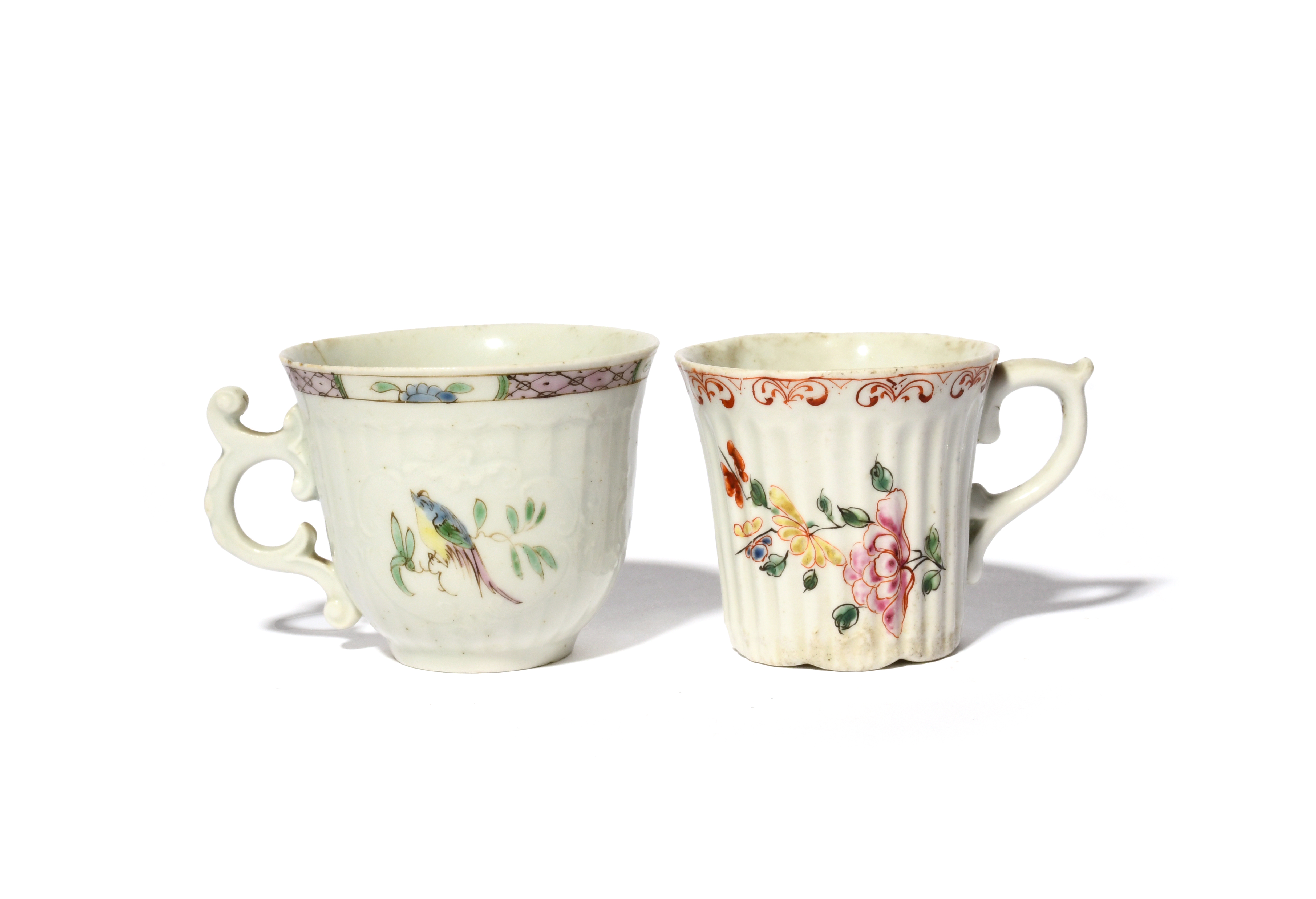 Two early Worcester coffee cups, c.1753-55, one of lobed and reeded form, painted with sprays of Oriental flowering plants, the other moulded with rococo panels and finely painted with aquatic and other birds, applied with a finely moulded scroll handle, the latter with two short rim cracks and associated nibbles, 5.5cm max. (2)
