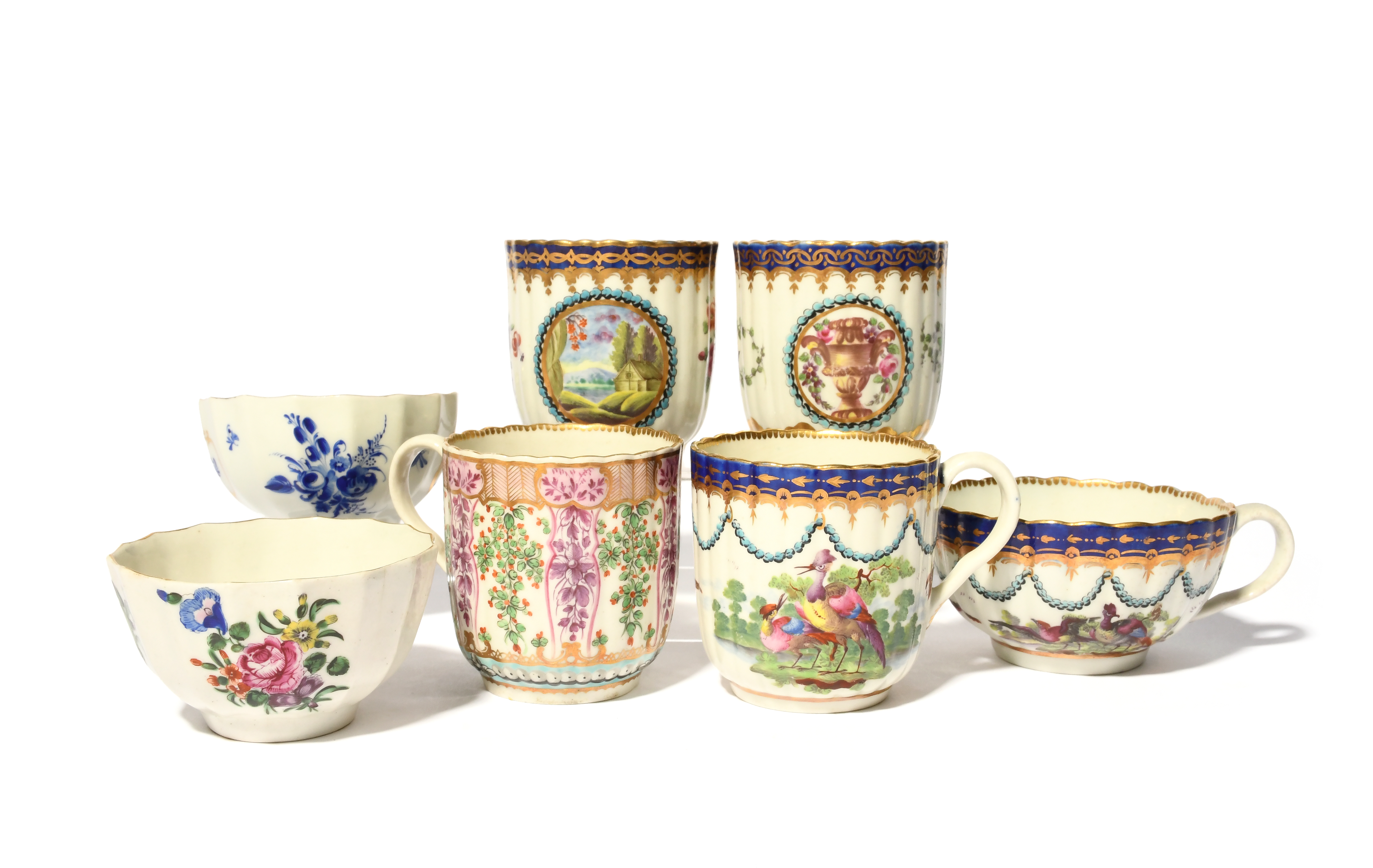 A group of Worcester fluted teawares, c.1770-80, two coffee cups painted with the Dalhousie manner with beaded panels flanked by flower and fruit sprays, one cup with a panelled 'Hop Trellis' Holly Berry pattern, a coffee cup and teacup with fancy birds beneath a turquoise husk garland band, the other two teabowls of Warmstry fluted form and painted with polychrome and dry blue flowers, 6.5cm max. (7)