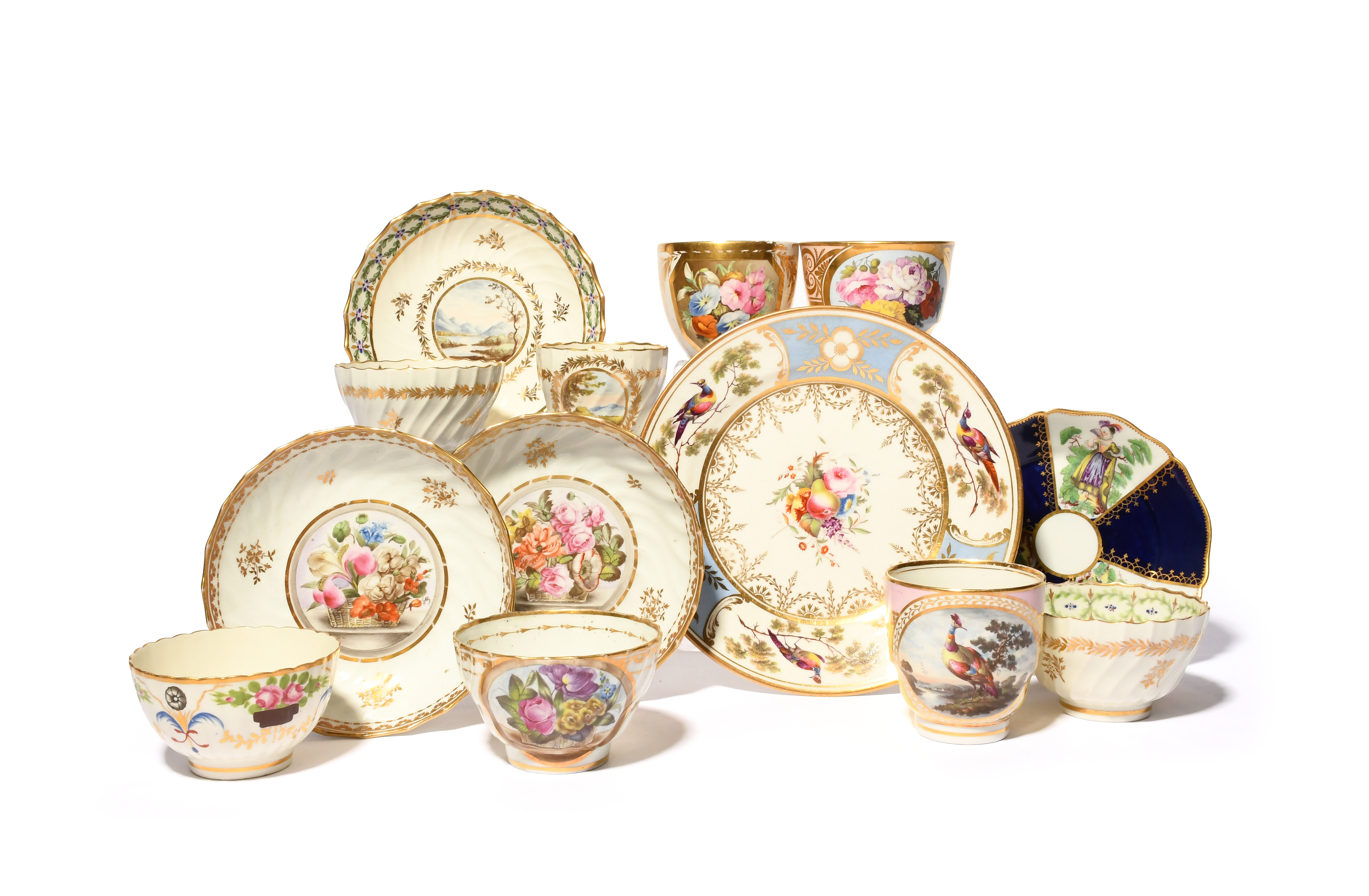 A group of mostly Worcester teawares, c.1775-1820, including a coffee cup painted with birds by George Davis, on a pink and yellow ground, a Chamberlain's plate with bird panels, a spiral-fluted cup and two saucers, probably also by George Davis with baskets of flowers, a Barr, Flight and Barr cup also with flowers, a similar Derby saucer, a lobed saucer painted in the Chelsea manner with panels of figures alternating with a blue ground, a Caughley trio painted in the Chamberlain's workshop with landscape panels within a leaf border, a similarly decorated teabowl, and a Caughley teabowl with a stylised pattern, 18.8cm max. (13)