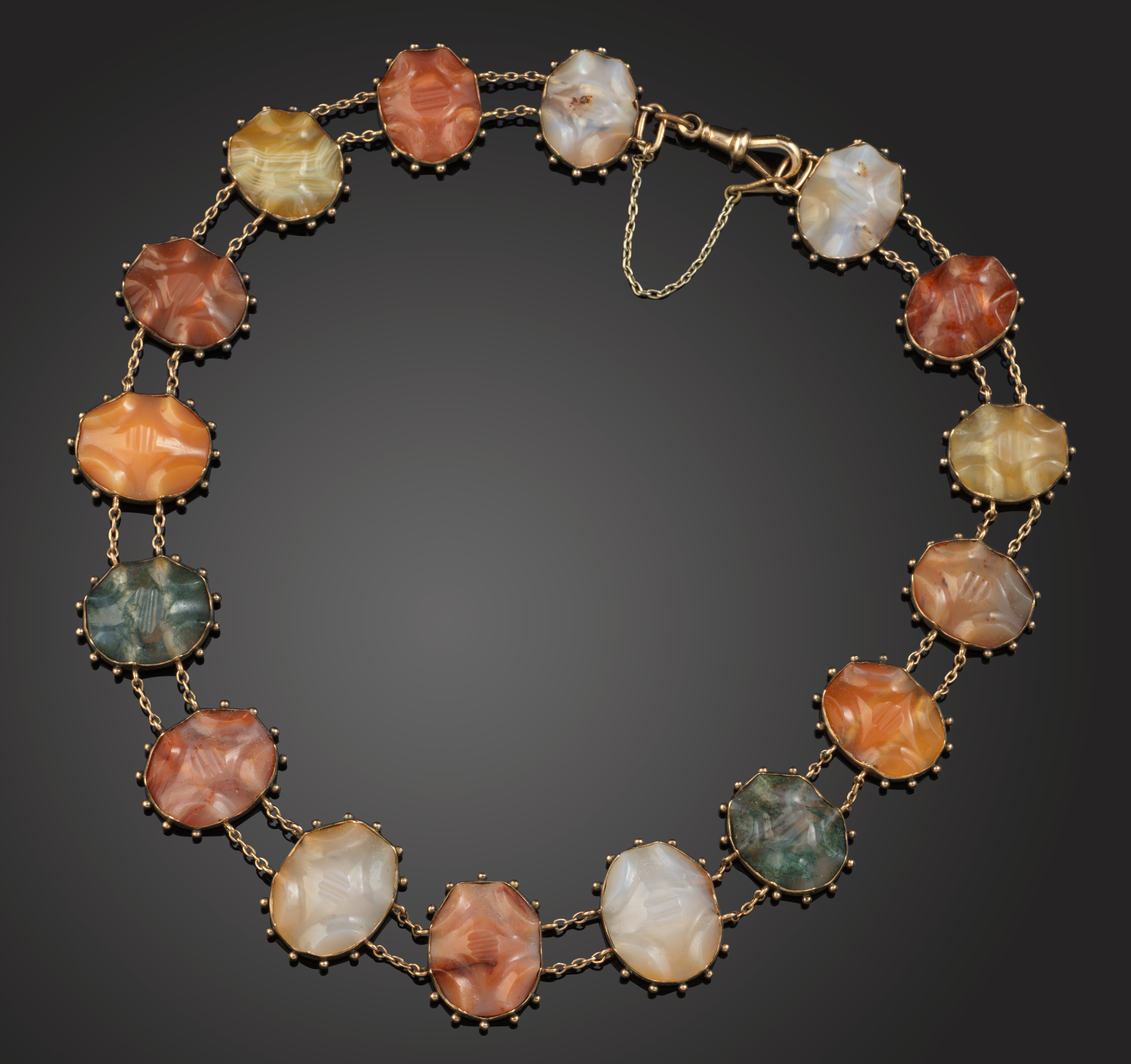 An unusual George III agate necklace, early 19th century, composed of carved hardstone links within beaded gold borders, connected by two strands of fine link chain, length 40cm, later clasp, two spare links