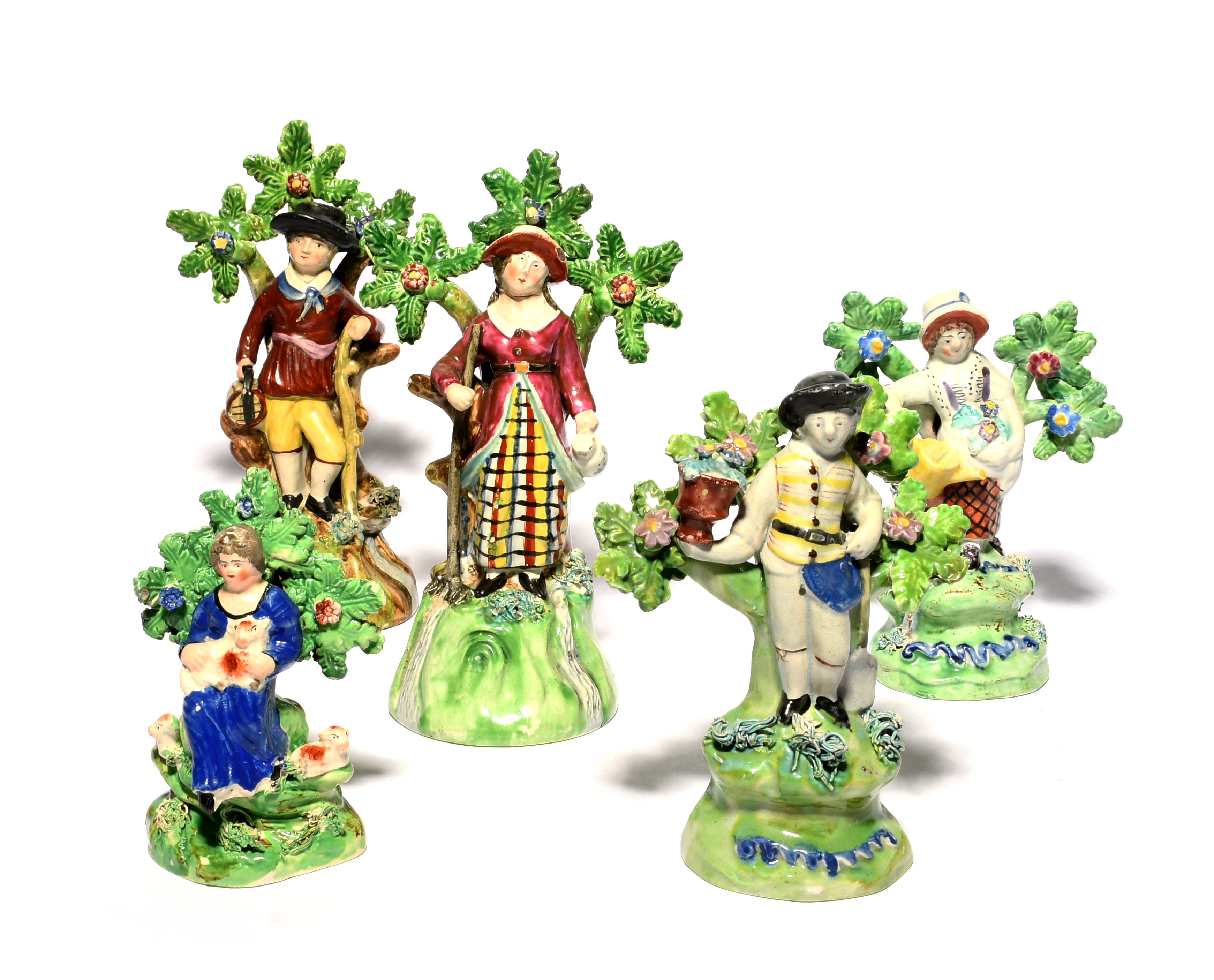 Two pairs of Walton pearlware figures, c.1800-20, the smaller pair of gardeners, standing before flowering bocage with a watering can and a spade, the larger pair of haymakers, he with a small barrel and a staff, she with a rake and a small jug or mug, with a small figure of a girl seated with three lambs, some restoration, 18cm max. (5)