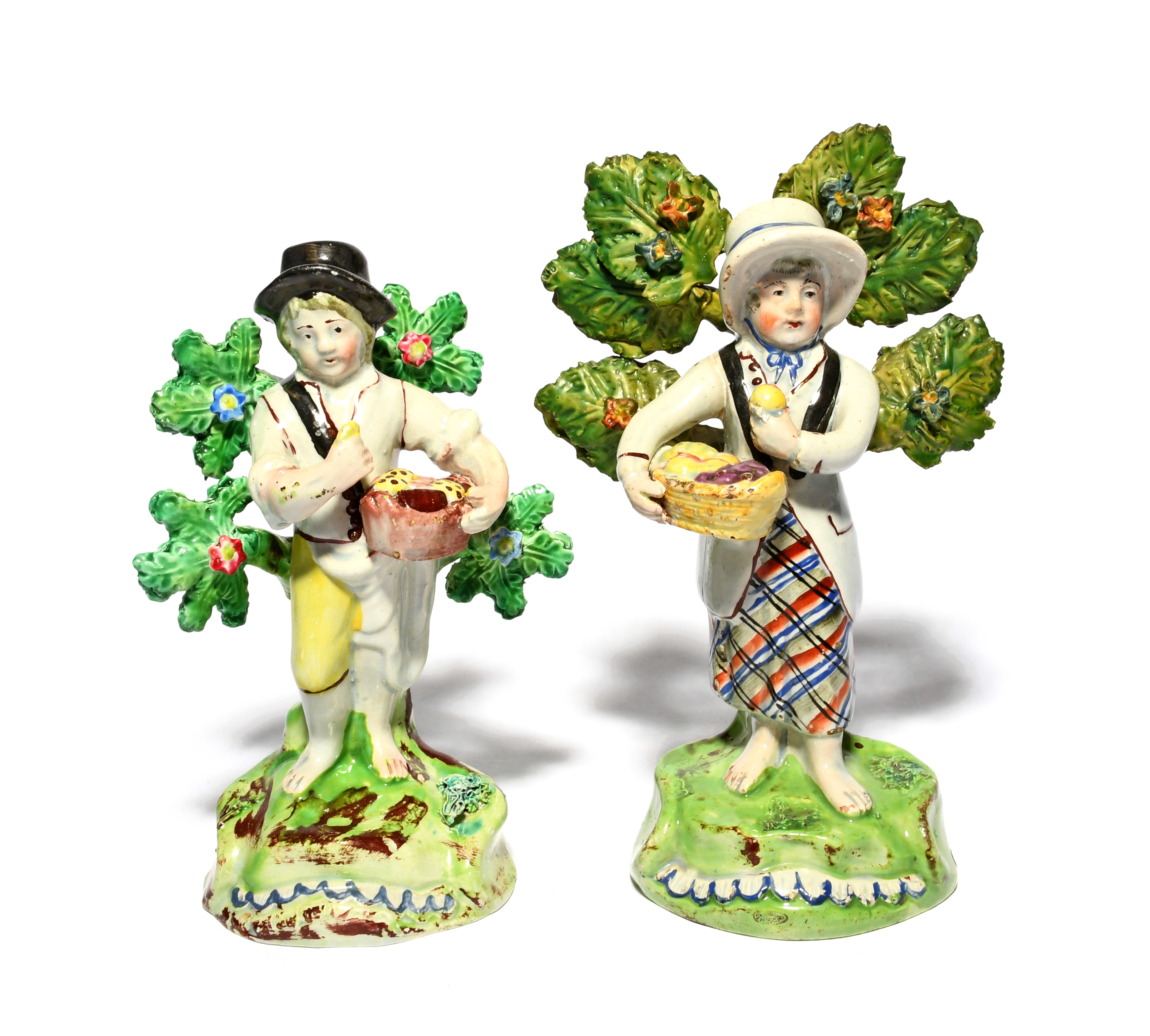 A near pair of Walton pearlware figures of children, 1st half 19th century, standing before flowering bocage and carrying baskets of fruit and bread, applied marks to the reverse, some faults, 19.3cm. (2)