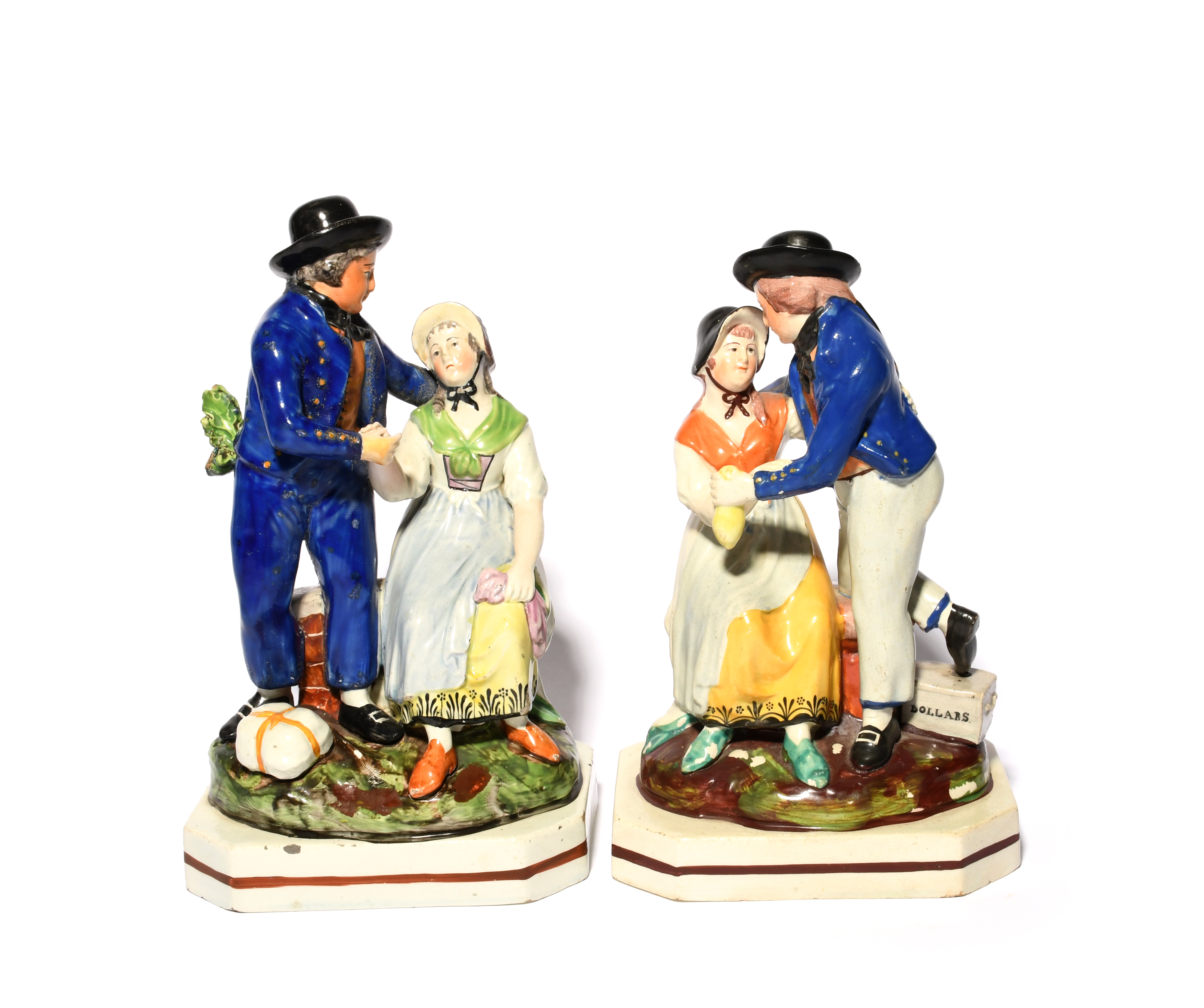 A pair of Staffordshire figure groups of sailors, early 19th century, depicting The Sailor's Farewell and The Sailor's Return, modelled with his sorrowful and relieved lass, raised on unusual octagonal bases, small restorations, 24.5cm. (2)