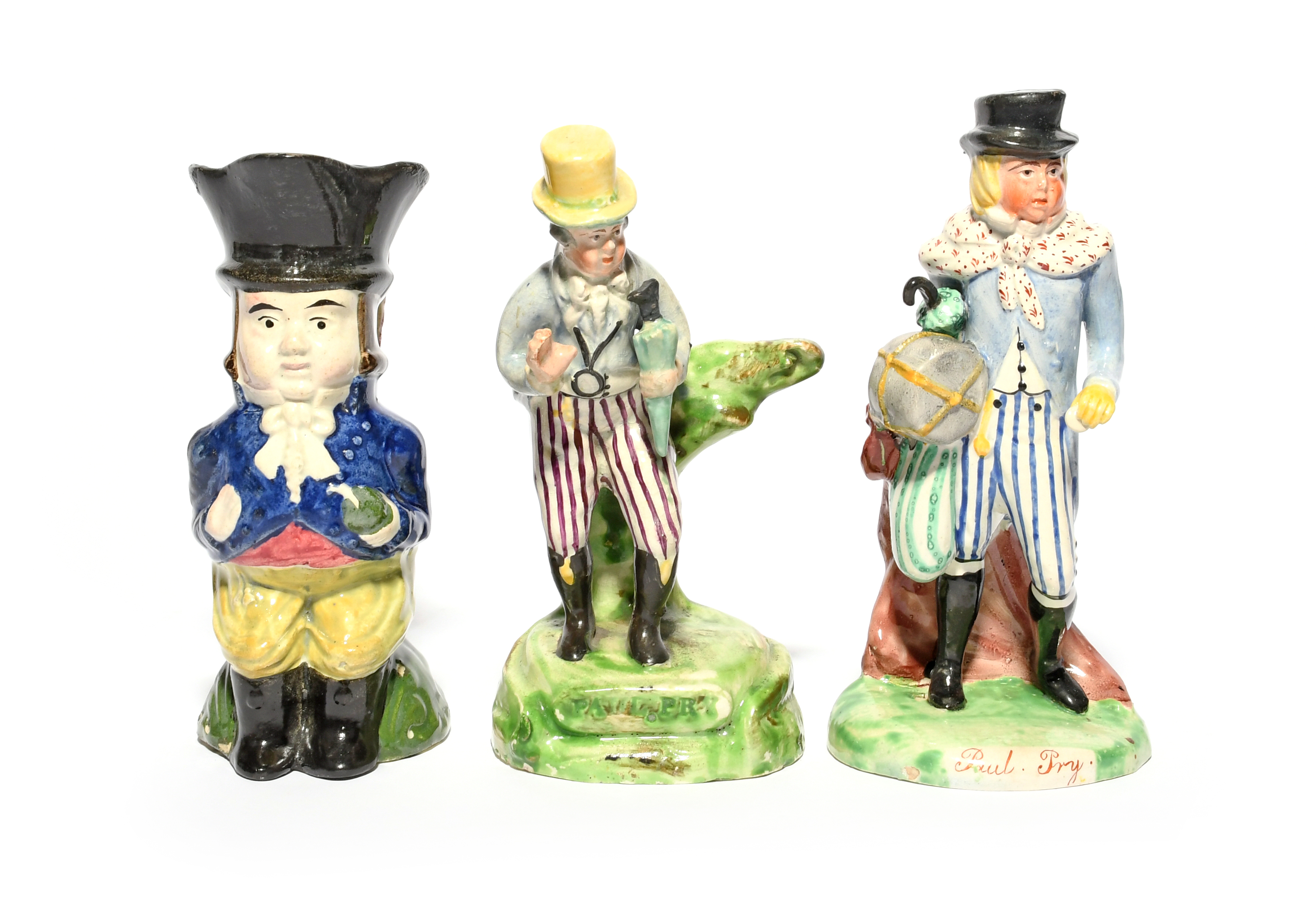 Two Staffordshire theatrical figures of the actor John Liston, c.1820, in his roles as Paul Pry and Lubin Log (the latter erroneously titled), applied Salt label to the reverse, and a small Staffordshire jug also modelled as Liston playing Paul Pry with an umbrella tucked under his arm, some restoration, 16.5cm max. (3)