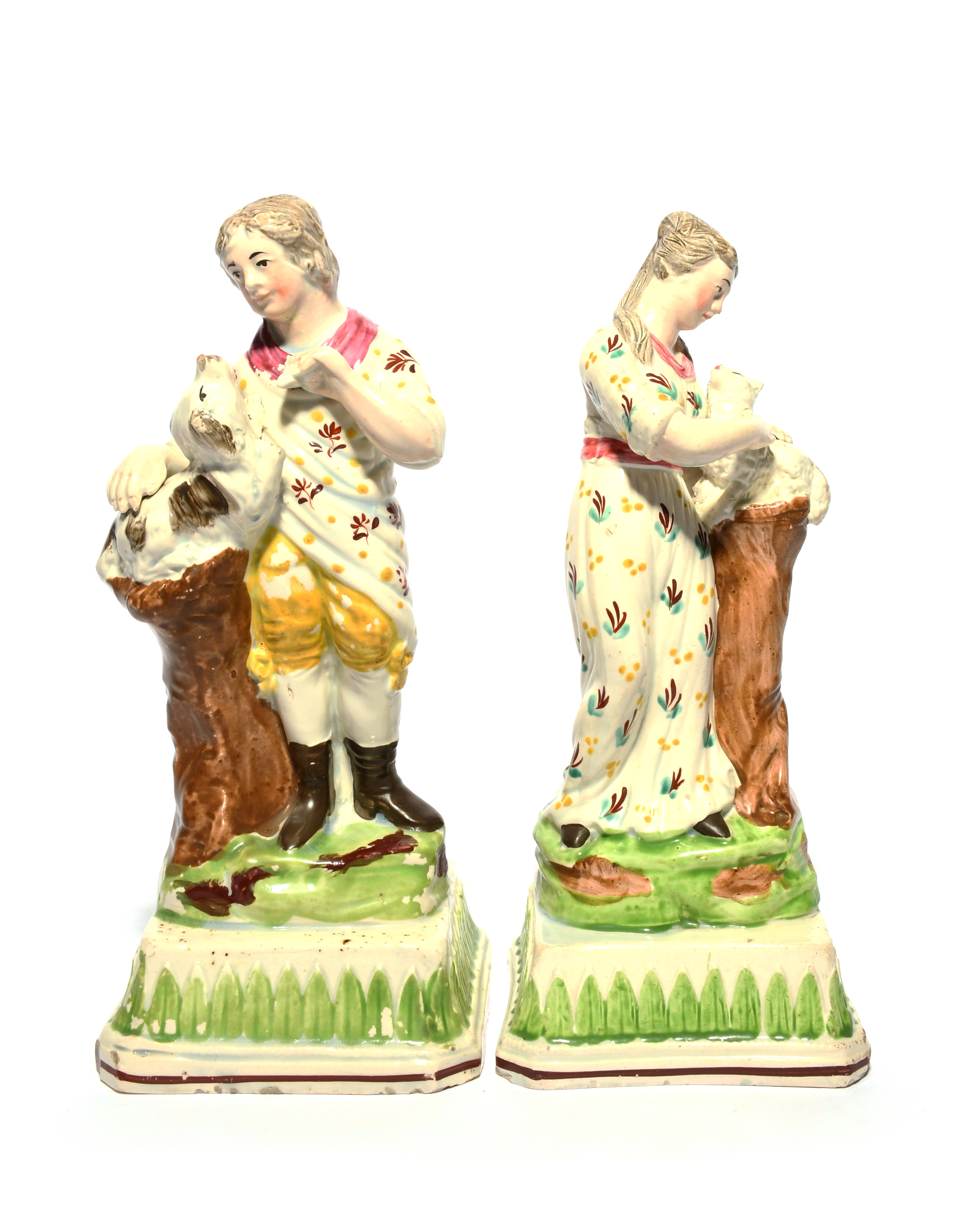 A pair of Staffordshire figures of children, c.1800, each standing beside a tall stump, the boy with a dog, the girl with a lamb, each raised on a chamfered square base moulded and painted with a band of stiff leaves, small chips to the bases, 19.5cm. (2)