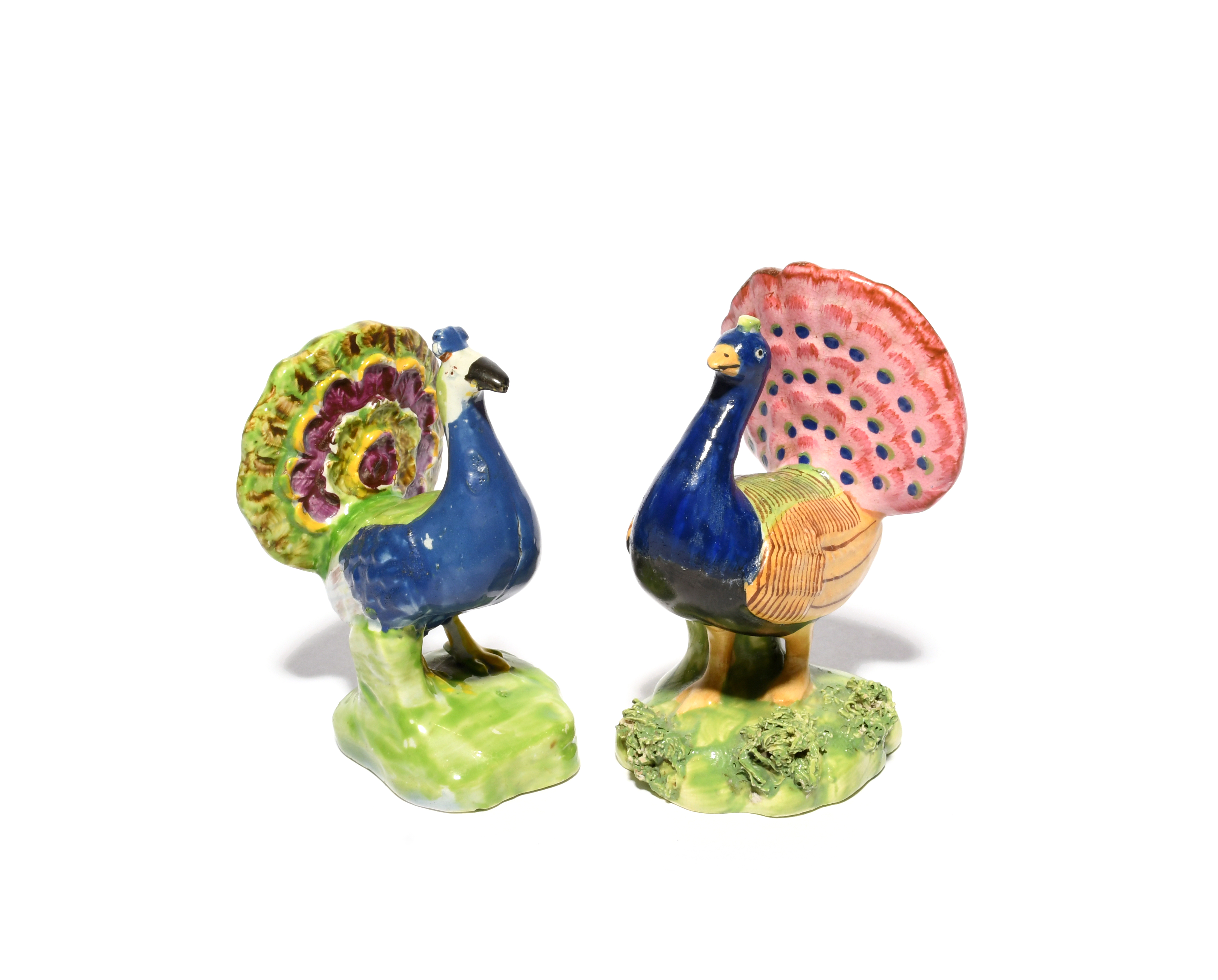 Two Staffordshire figures of peacocks, c.1820, each standing with colourful tail on display and heads erect, raised on grassy bases, restoration to one neck, 10cm max. (2)