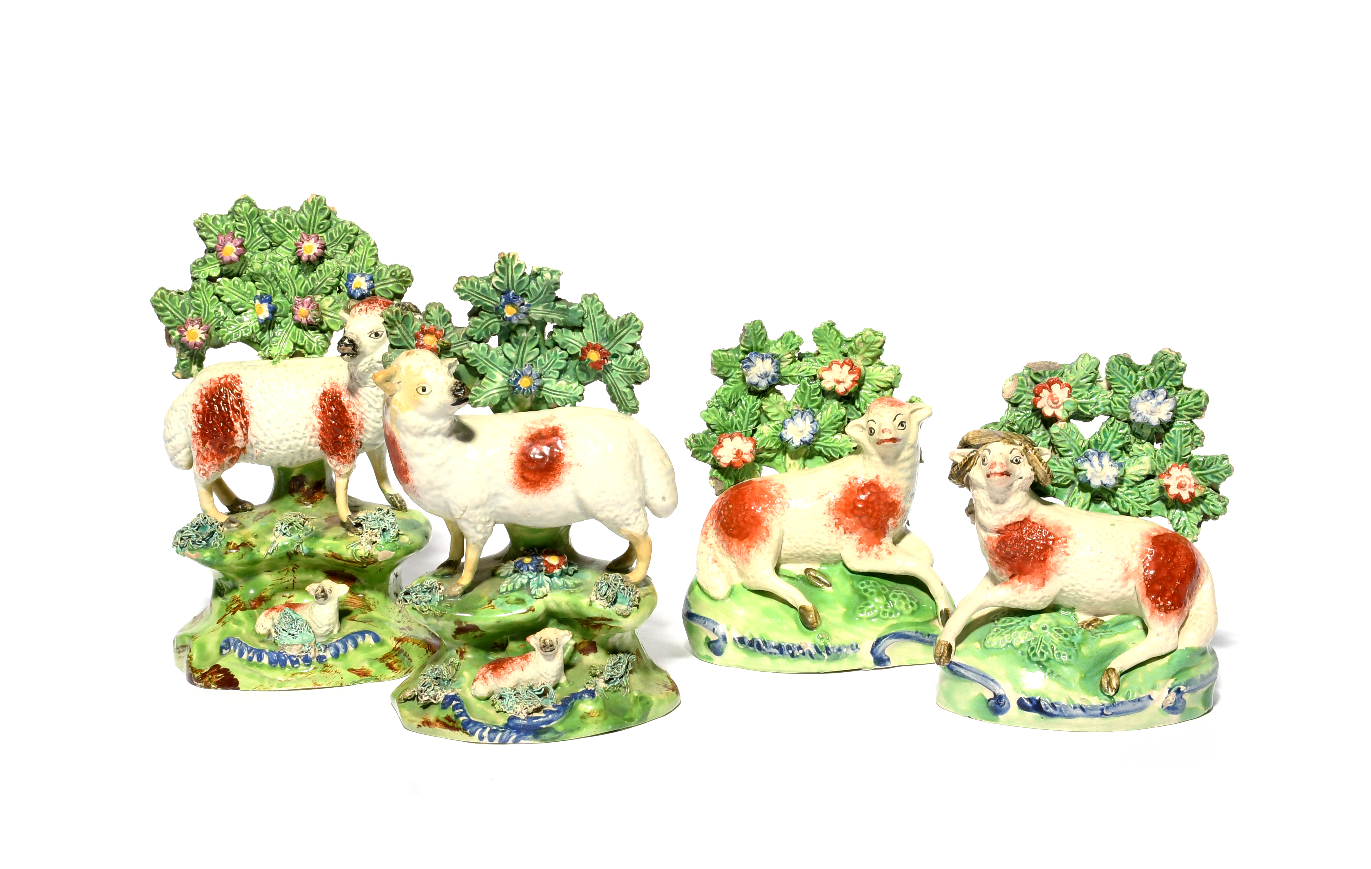 A matched pair of Walton pearlware figures of sheep, 1st half 19th century, standing with heads turned before flowering bocage, each with a recumbent lamb on the base, applied marks to the reverse, and a smaller pair of Staffordshire figures of sheep, recumbent on bases with blue scroll detailing, some restoration, 16.5cm max. (4)