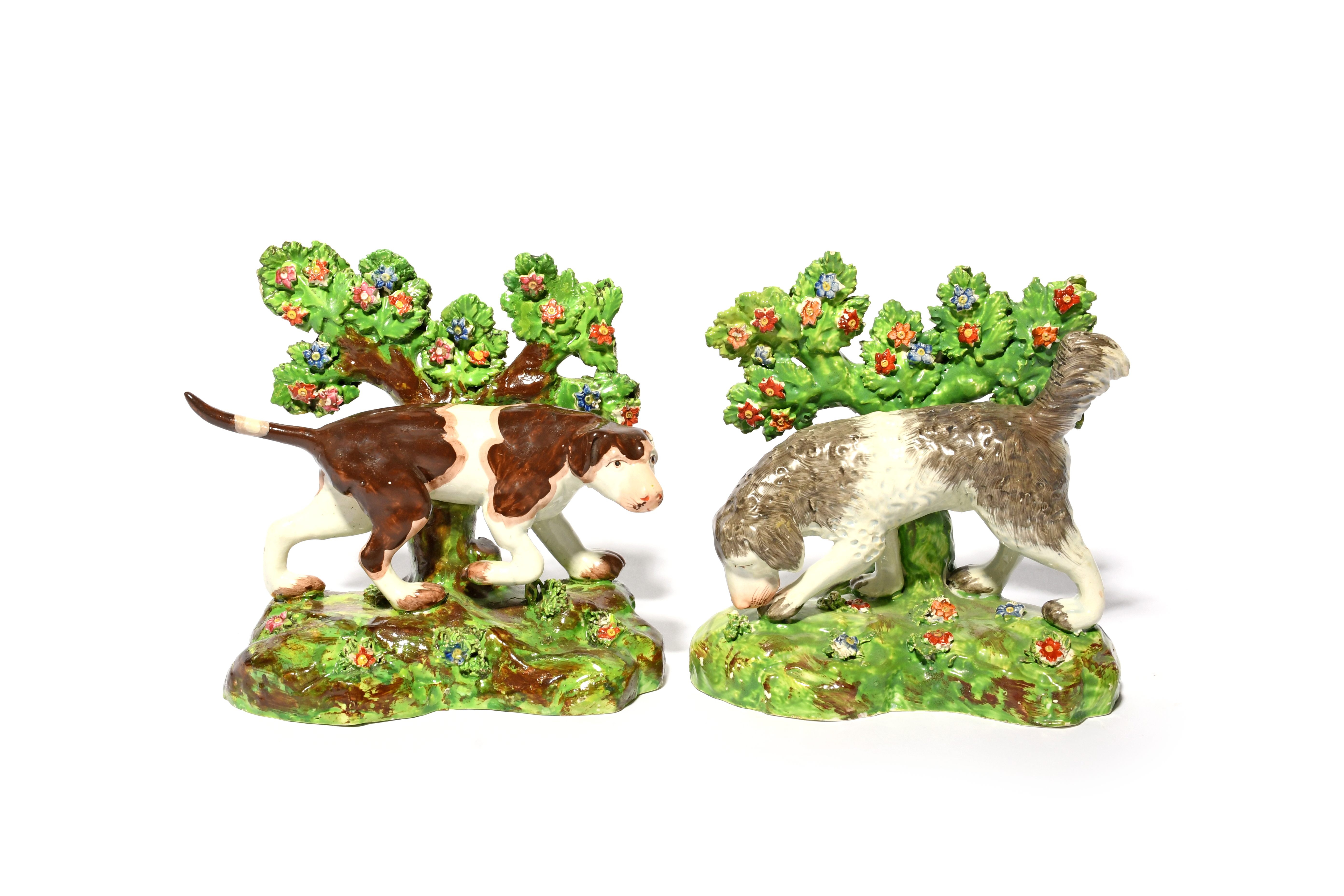 A matched pair of Staffordshire figures of working dogs, 1st half 19th century, one a pointer with tail erect, the other a setter with its nose to the ground, each standing before flowering bocage, some good restoration, 14.5cm max. (2)
