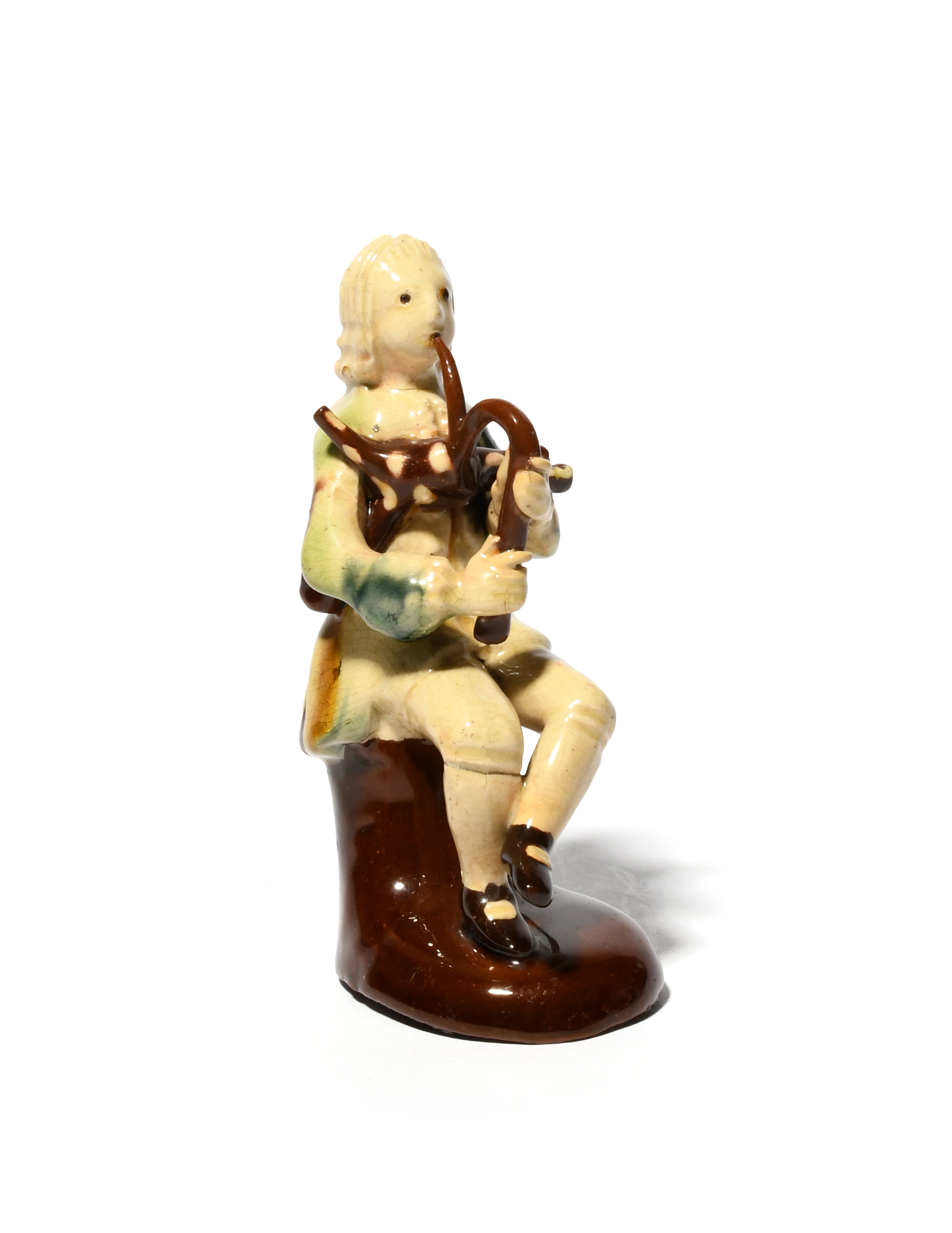 A Staffordshire lead-glazed figure of a musician, mid 18th century, of Astbury-Whieldon type, seated and playing the bagpipes, raised on a treacle-glazed base, 12.5cm.