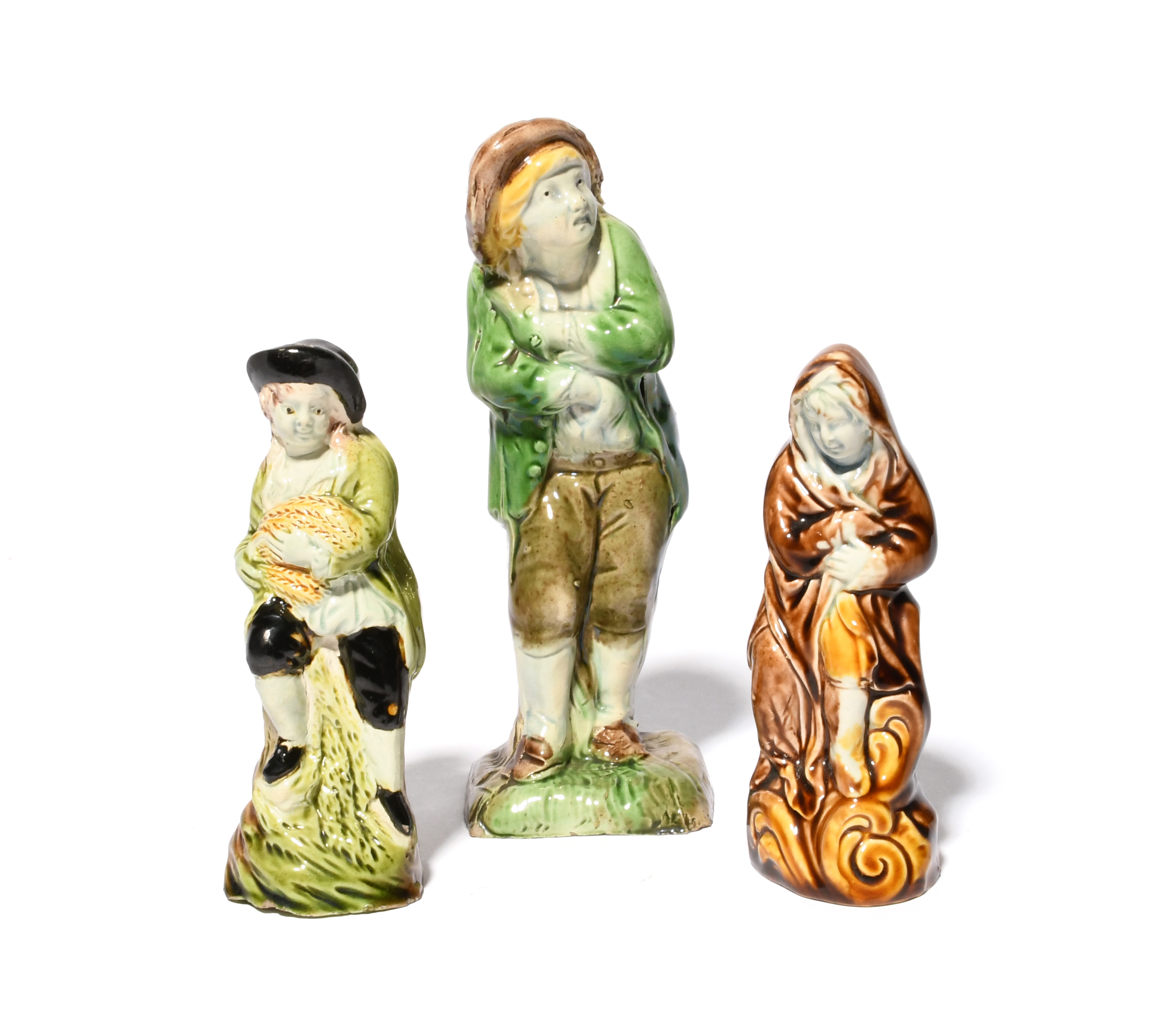 A Ralph Wood figure of a boy, c.1790, possibly emblematic of Winter, standing with his hands tucked inside his shirt, a small Ralph Wood figure of Summer, modelled as a boy holding a sheaf of corn, and a lead-glazed figure of Winter huddled in a large cloak decorated in a manganese glaze, 17.2cm max. (3)
