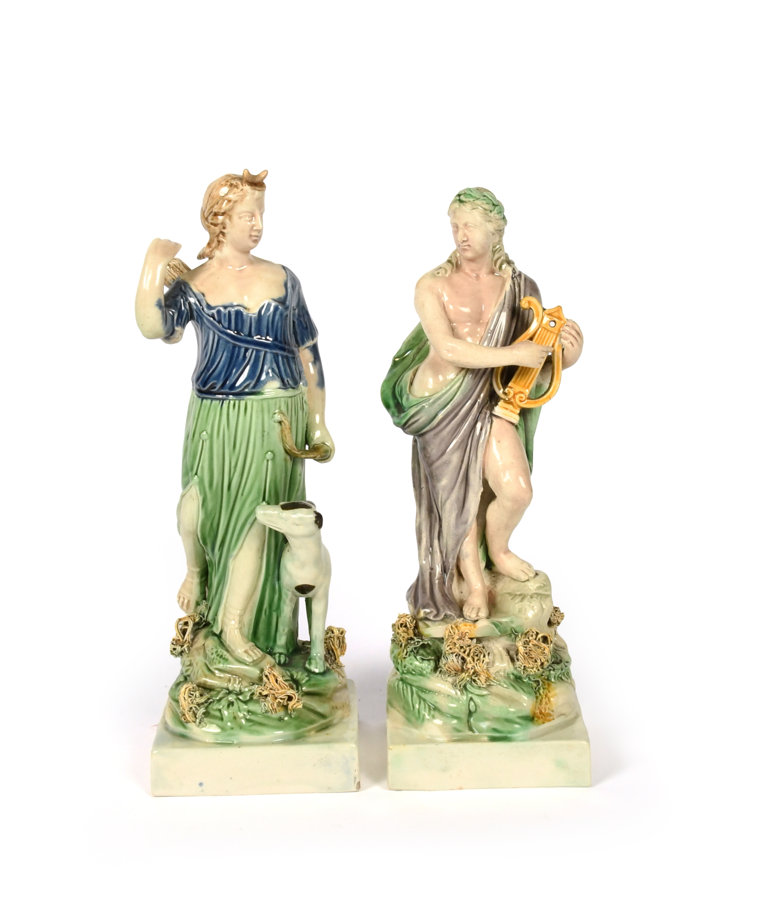 A pair of Ralph Wood figures, c.1785, of Apollo and Diana, standing on rocky stumps raised on square bases, Apollo holding a lyre and wearing a laurel crown, Diana holding a bow and drawing an arrow from a quiver, her dog at her side, washed in a muted palette of green, blue, grey and ochre, a small amount of good restoration to one, 23cm. (2)