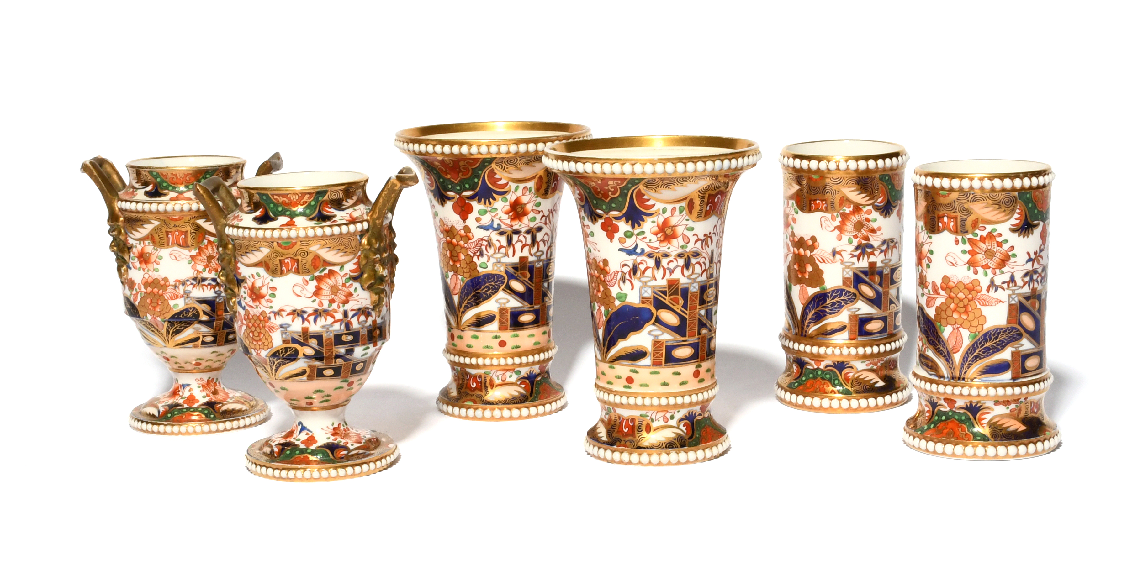 Three pairs of Spode spill vases, c.1820, one pair cylindrical, another of flared form, the last footed with twin handles issuing from masks, all decorated in pattern 967 with bands of white beading, some restoration to the handles, 11.5cm max. (6)