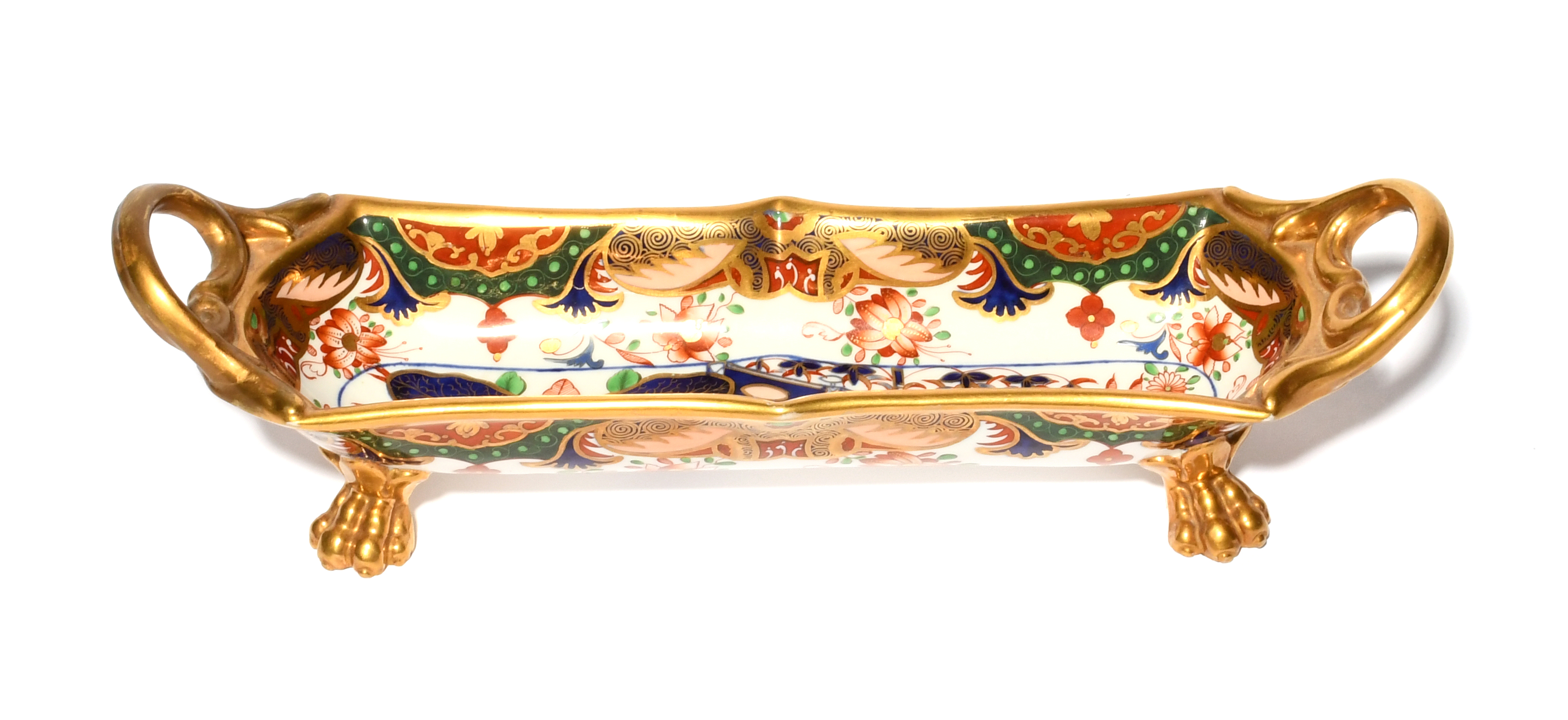 A large Spode pen tray, c.1820, the shaped rectangular form richly decorated in pattern 967 and raised on four gilt paw feet, iron red factory mark and pattern number, a repair to one handle, 28cm across.