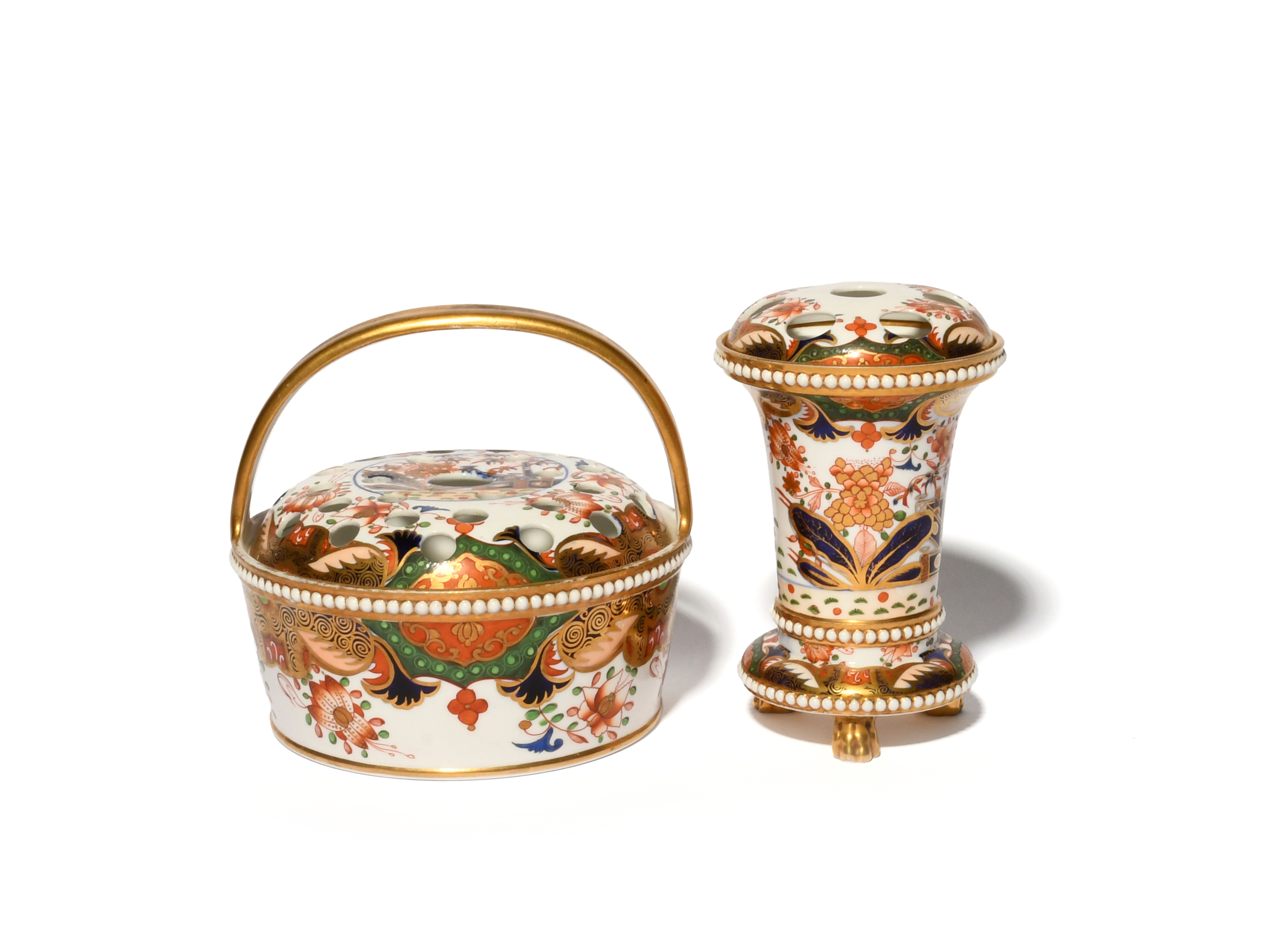 A Spode pot pourri basket and cover, c.1820, the circular form with a gilded overhead handle, the cover pierced with three rows of holes around a central aperture, and a small Spode pot pourri vase and cover, raised on three paw feet, both decorated in pattern 967 and with rows of white beading, a hairline crack to the vase's cover, 13cm max. (4)