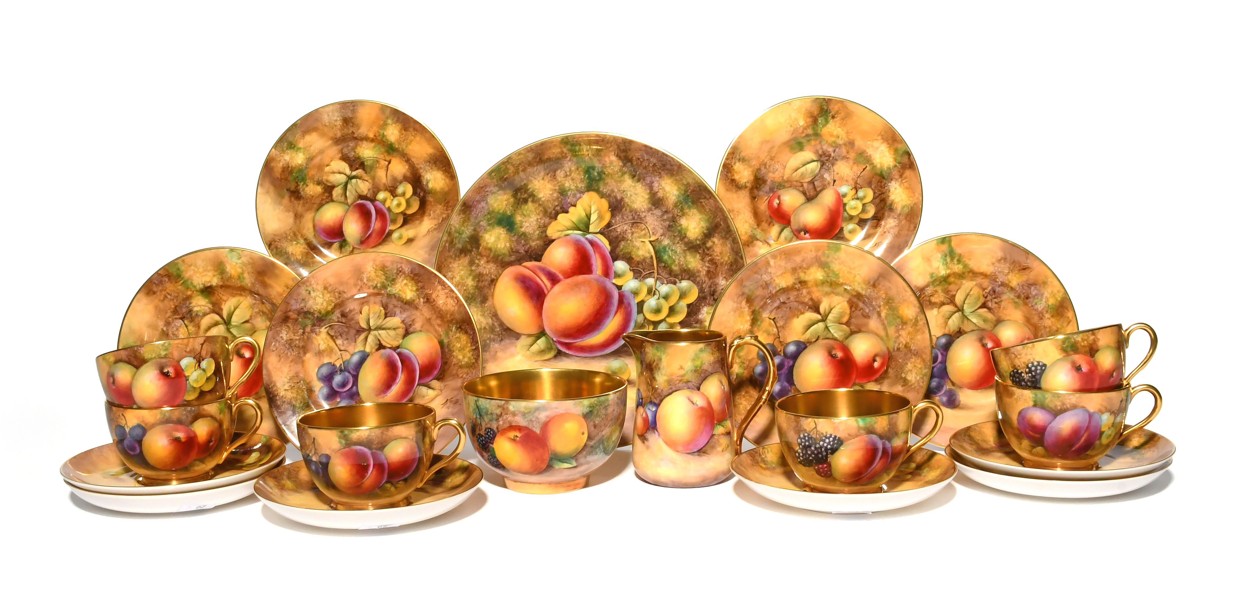 A good Royal Worcester tea service, 1970s, painted with fruit including apples, blackberries, grapes and peaches, against a woodland floor, signatures including J Smith, J Cook and C Smith, the cups, bowl and jug all richly gilded to the interior, black factory marks. Comprising: a sugar bowl, a milk jug, six teacups, six saucers, six side plates and a cake plate. (21)