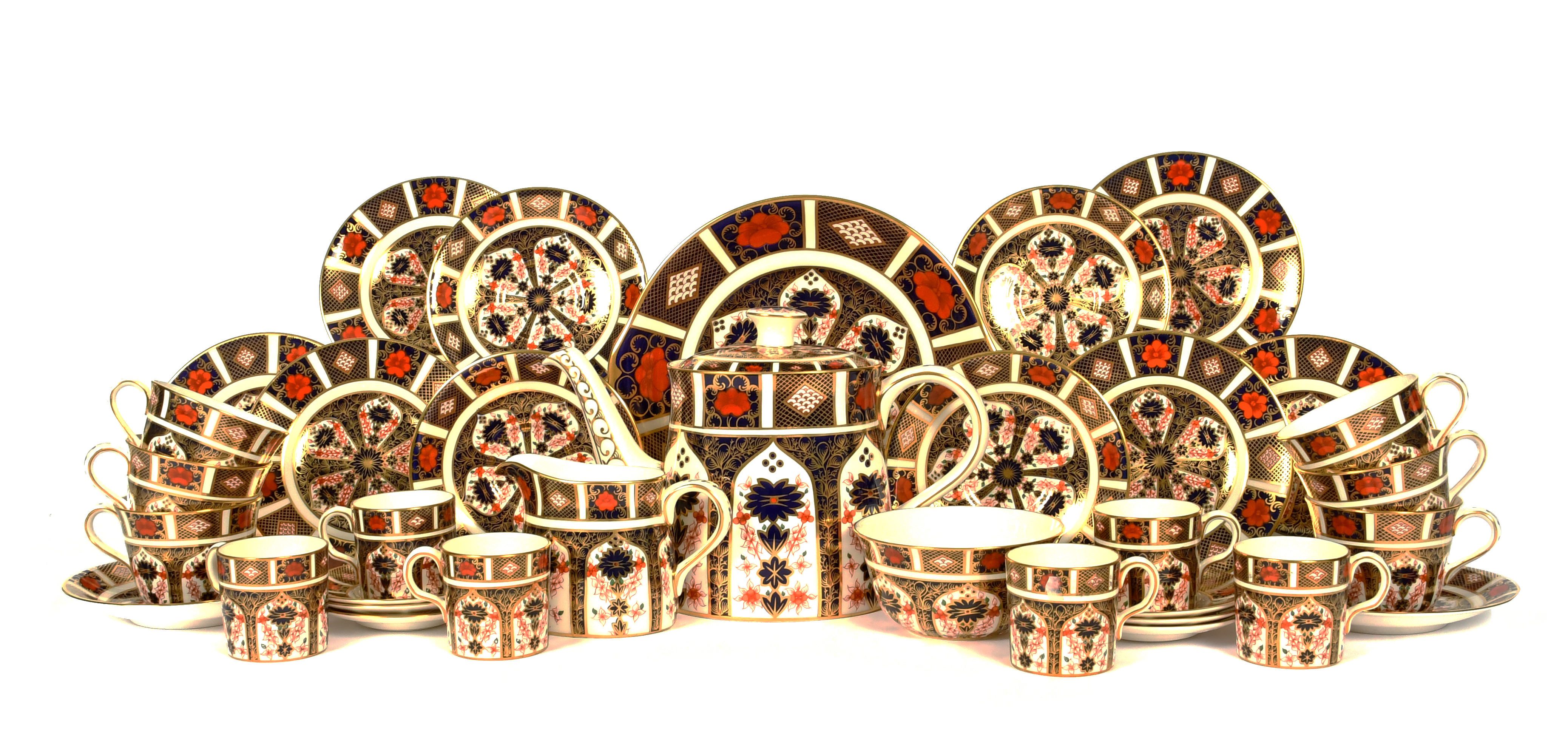 A Royal Crown Derby tea and coffee service, c.1979, richly decorated in pattern 1128 with an Imari