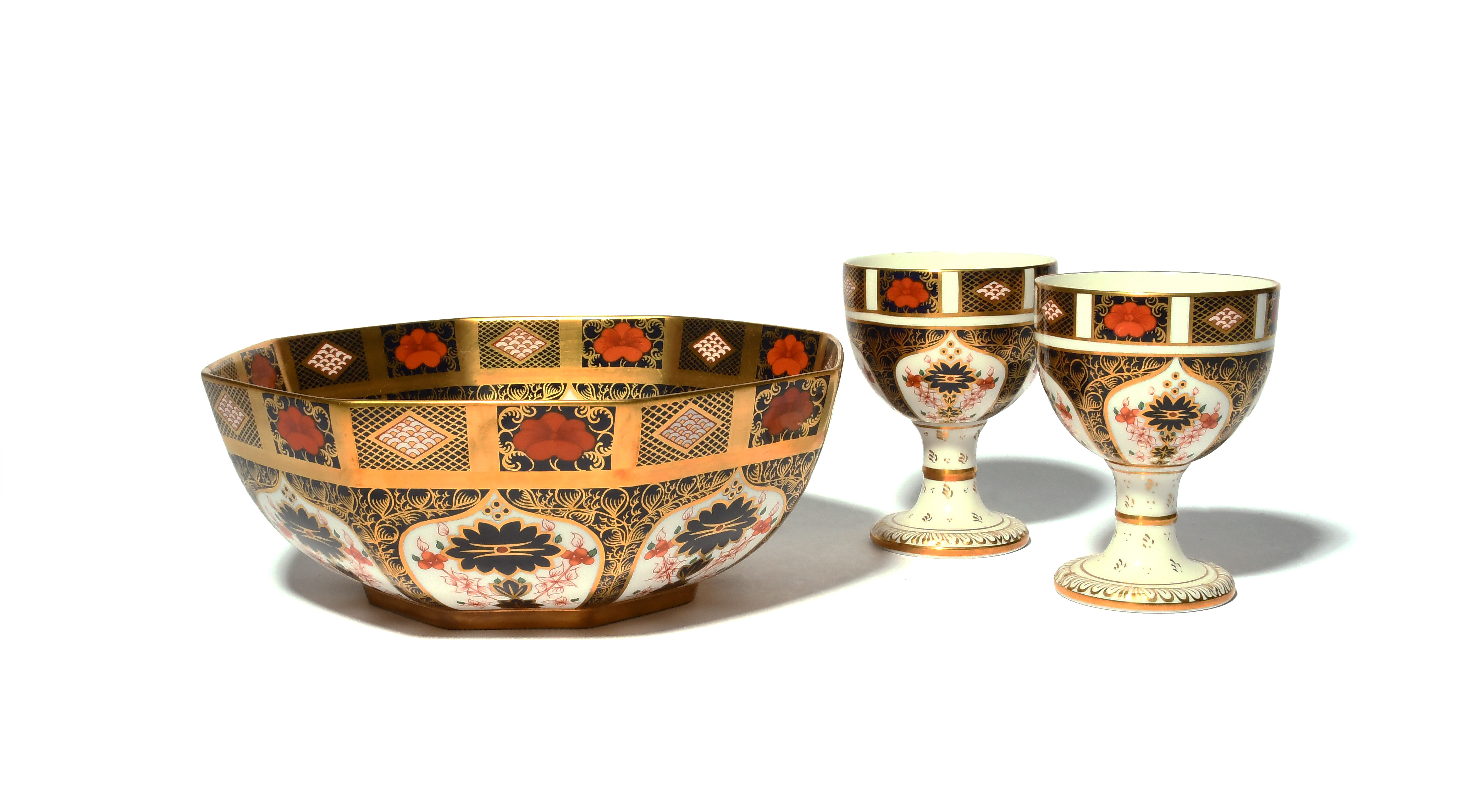 A large Royal Crown Derby octagonal bowl, date code for 1981, and a pair of goblets with date codes