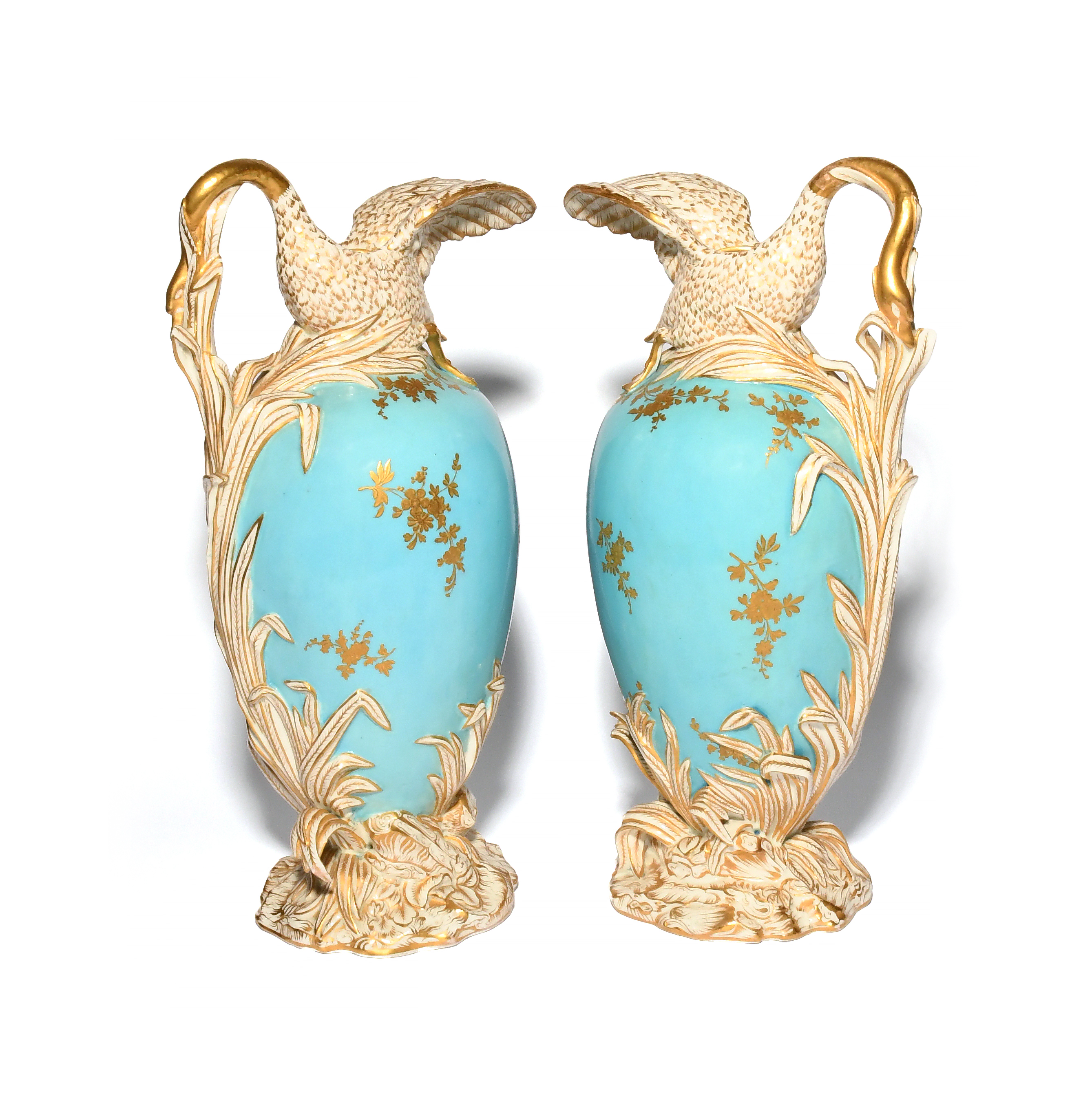 A large pair of English porcelain ewers, 19th century, probably Brown-Westhead Moore & Co., the ovoid bodies with gilt flower sprigs on a turquoise ground, the spouts and handles formed from a swan with outstretched wings reaching into bulrushes, raised on rocky bases with further reeds picked out in gilt, some faults, 48cm. (2)