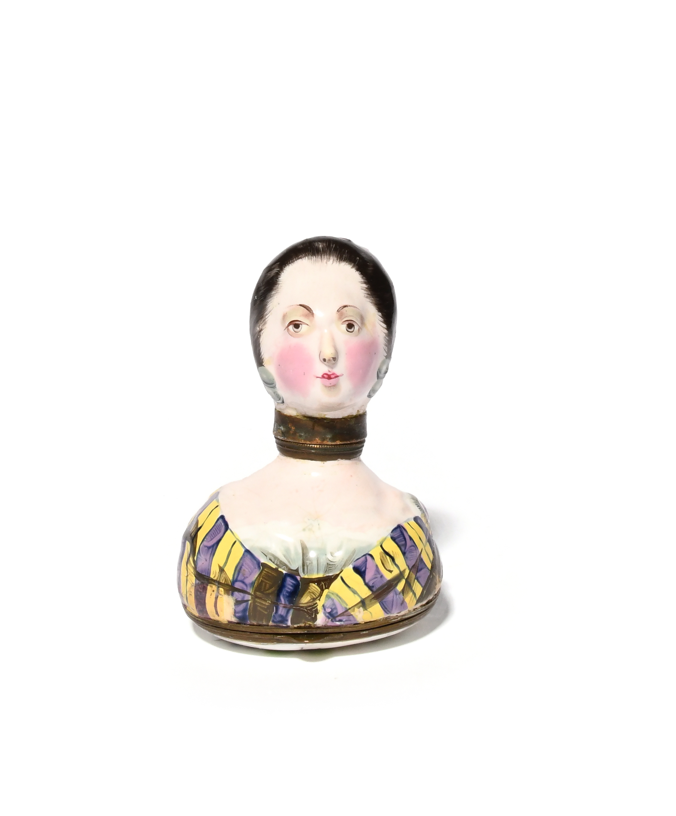 A rare South Staffordshire Jacobite portrait combined scent bottle and bonbonniere, c.1765, modelled as the head and shoulders of Flora MacDonald, wearing a purple and yellow tartan shawl, a pink rose in her hair, the hinged cover of the bonbonniere painted with flowers, some restoration to the bonbonniere's cover, 7.7cm.