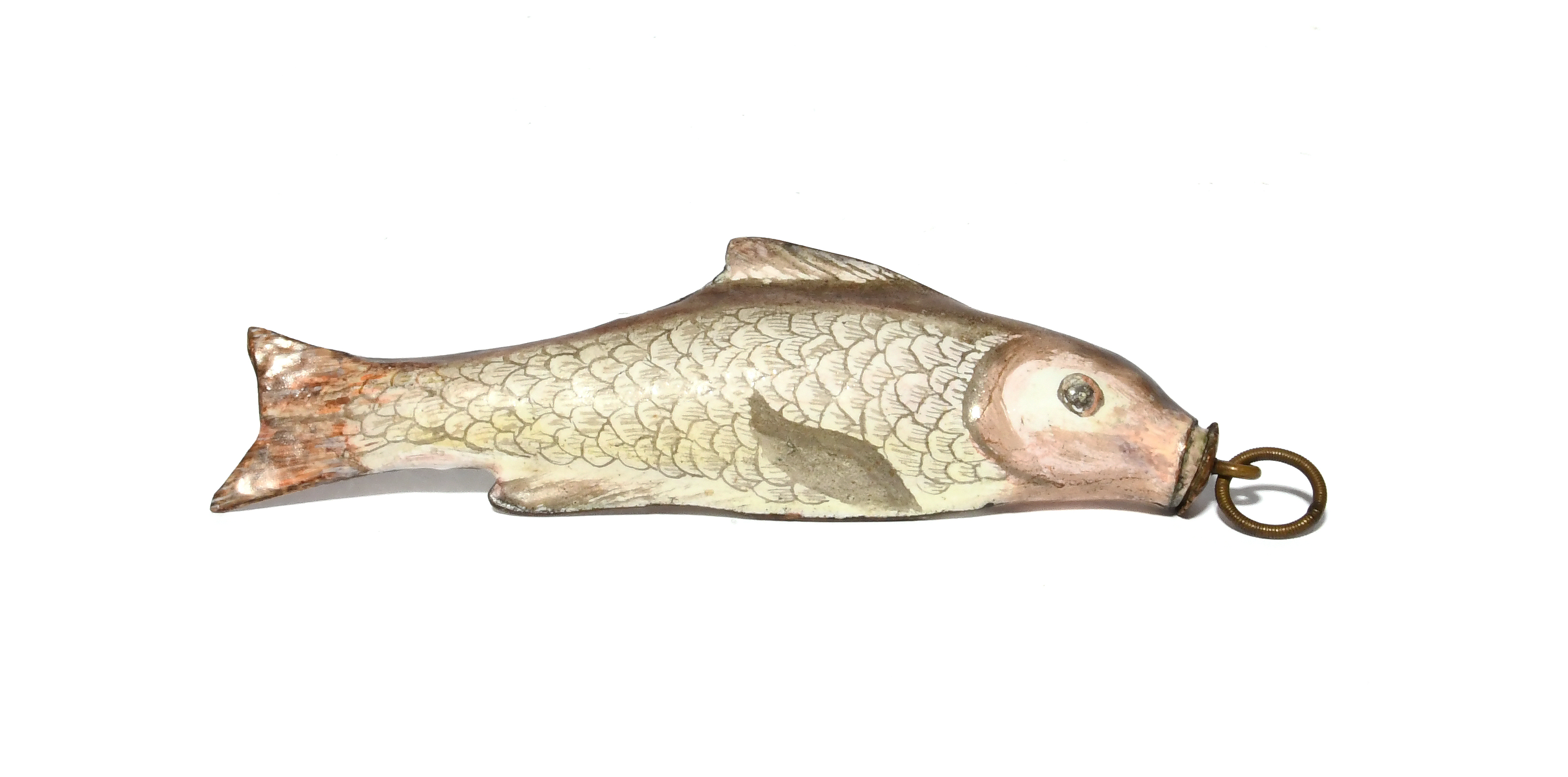 A Continental enamel scent bottle, late 18th/early 19th century, formed as a long fish with naturalistically painted scales, its mouth forming the aperture and fitted with a copper mounted stopper, 12cm.