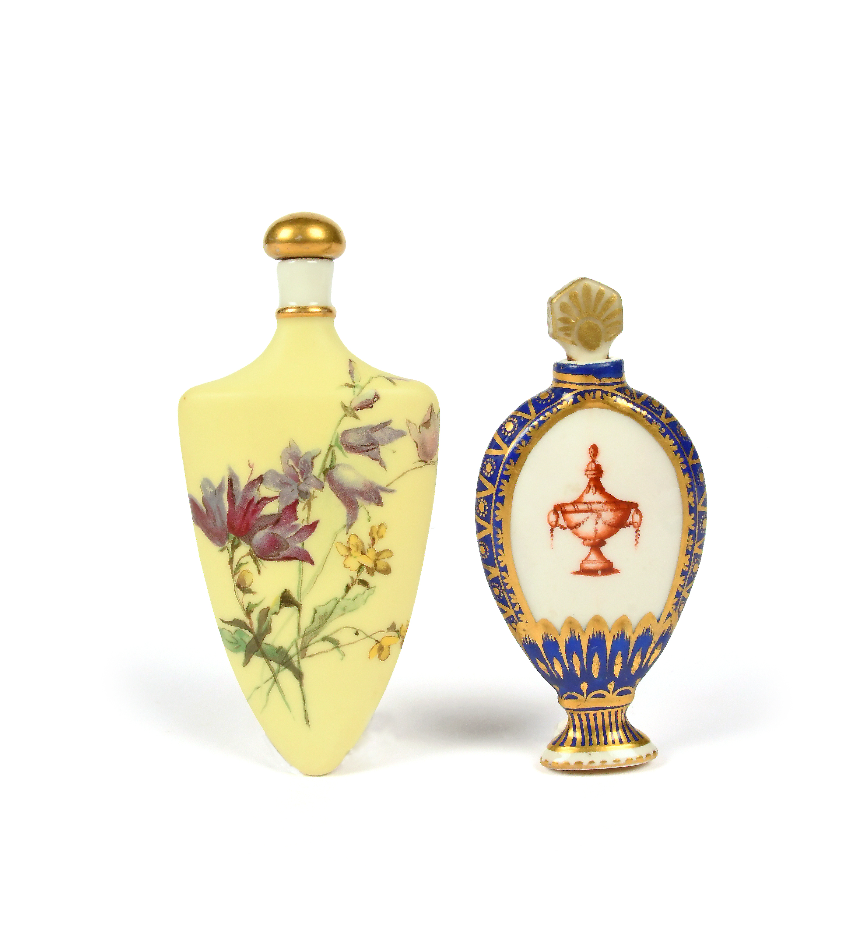 A Chelsea-Derby scent bottle or flask, c.1770, the flattened body painted in the manner of James Giles with festooned urns in red monochrome, reserved on a blue ground with gilt detailing, and a Royal Worcester scent bottle of shield shape, decorated with loose flower sprays on a yellow ground, the Chelsea-Derby stopper a replacement, 10cm. (2)