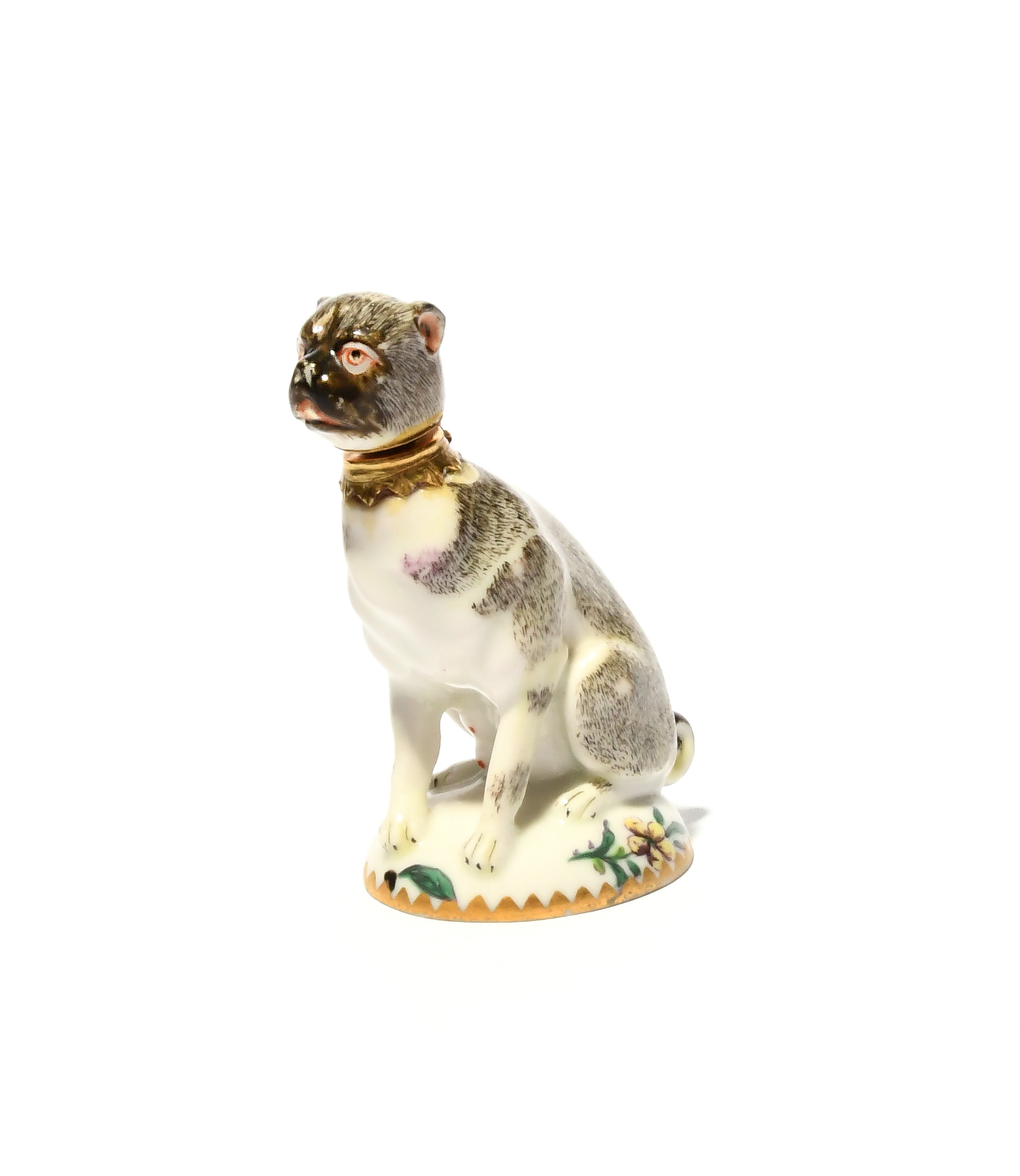 A Chelsea scent bottle modelled as a pug, c.1760, the dog seated on its haunches, with gilt metal mounts to its neck, on a mound base painted with flower sprays to both sides, 6cm.