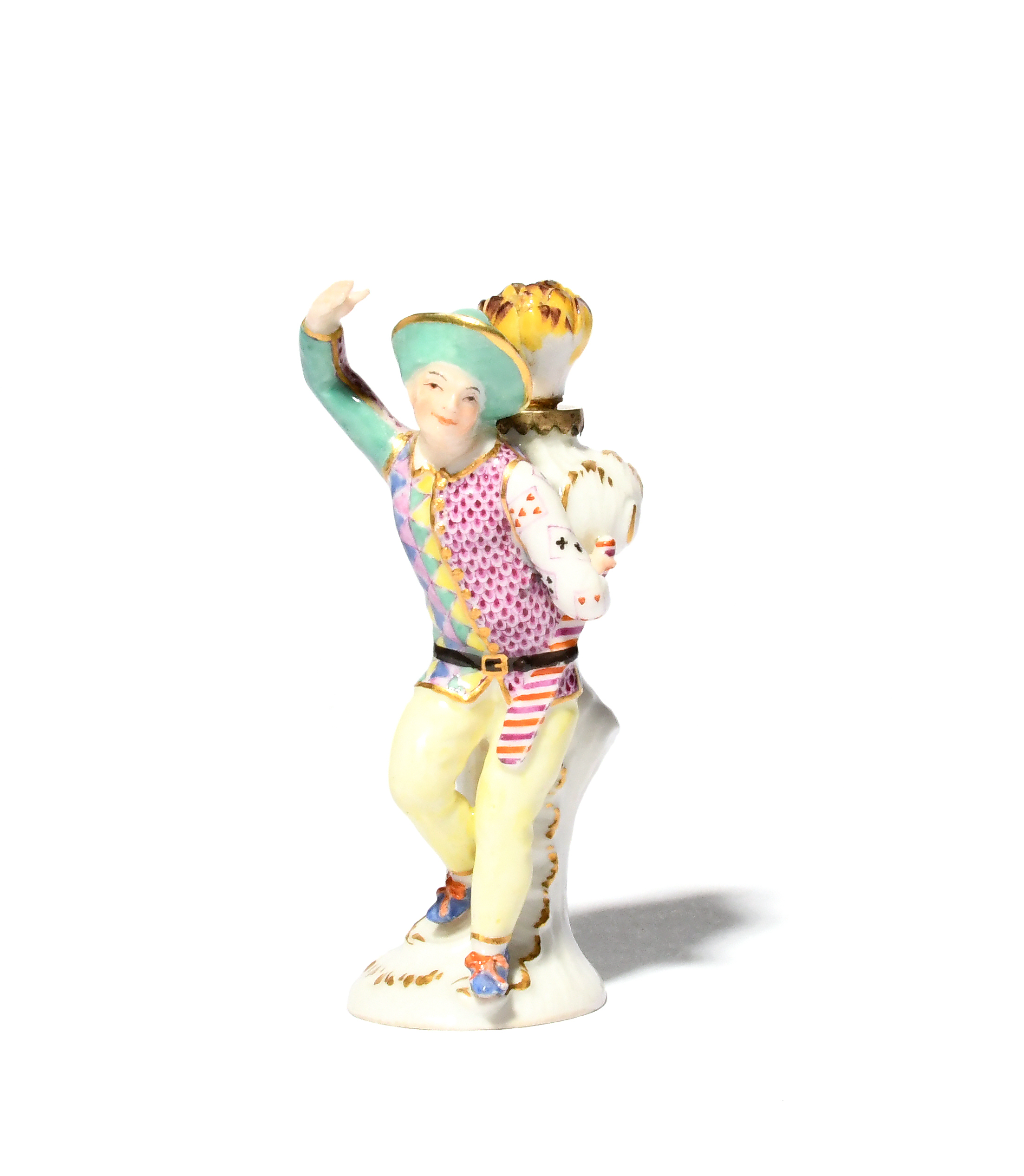 A Meissen figural scent bottle, c.1740-50, modelled as Harlequin in colourful costume, leaning up