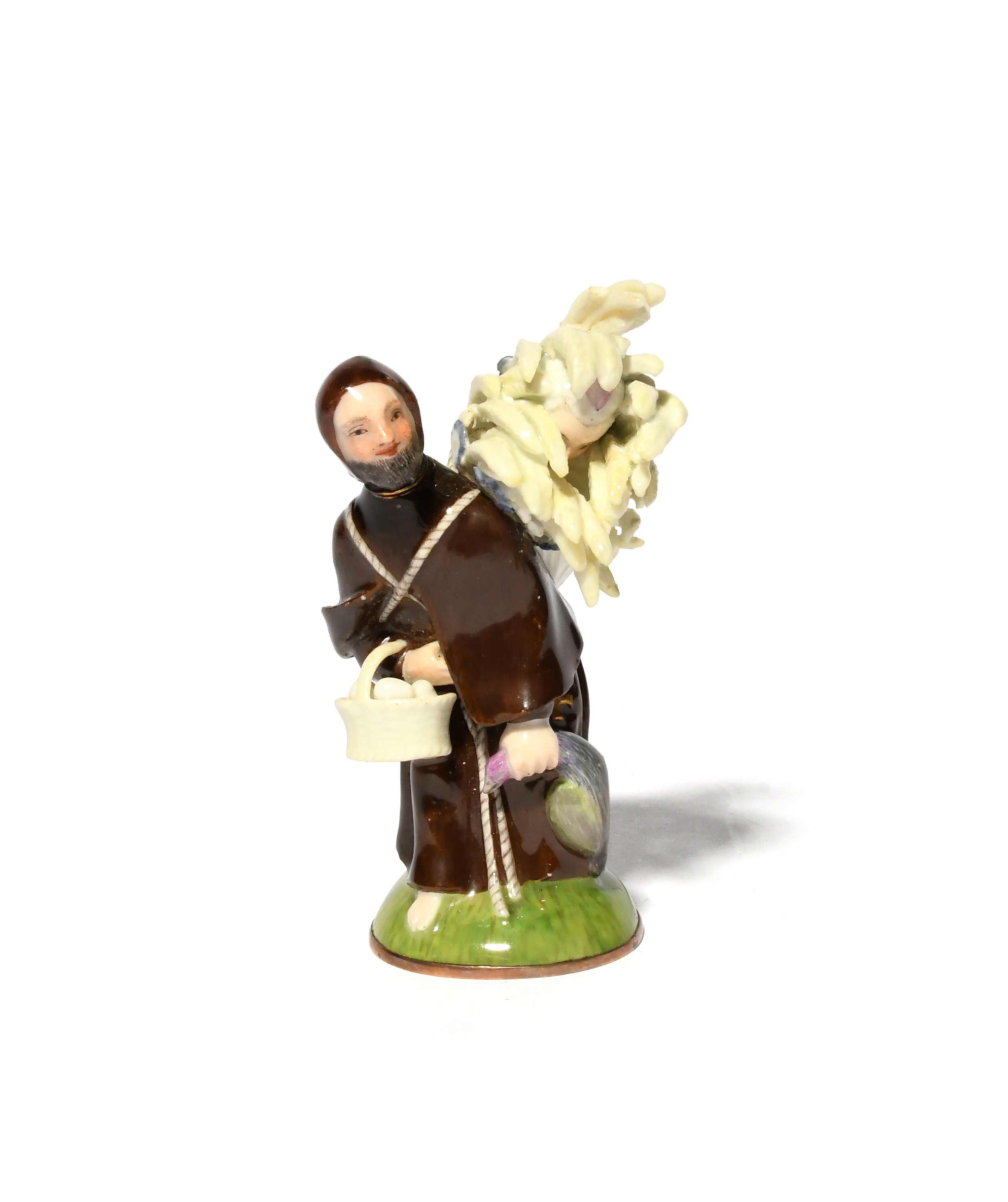 A Meissen double scent bottle, c.1740, modelled as a provender to the monastery, the barefoot monk carrying a basket of eggs and a dead bird, a sheaf of corn on his back concealing a young woman with feet protruding, his head and part of the sheaf forming the stoppers, underneath the domed base painted with flowers, blue crossed swords mark beneath a gilt star, a small amount of restoration to the corn, 8cm.