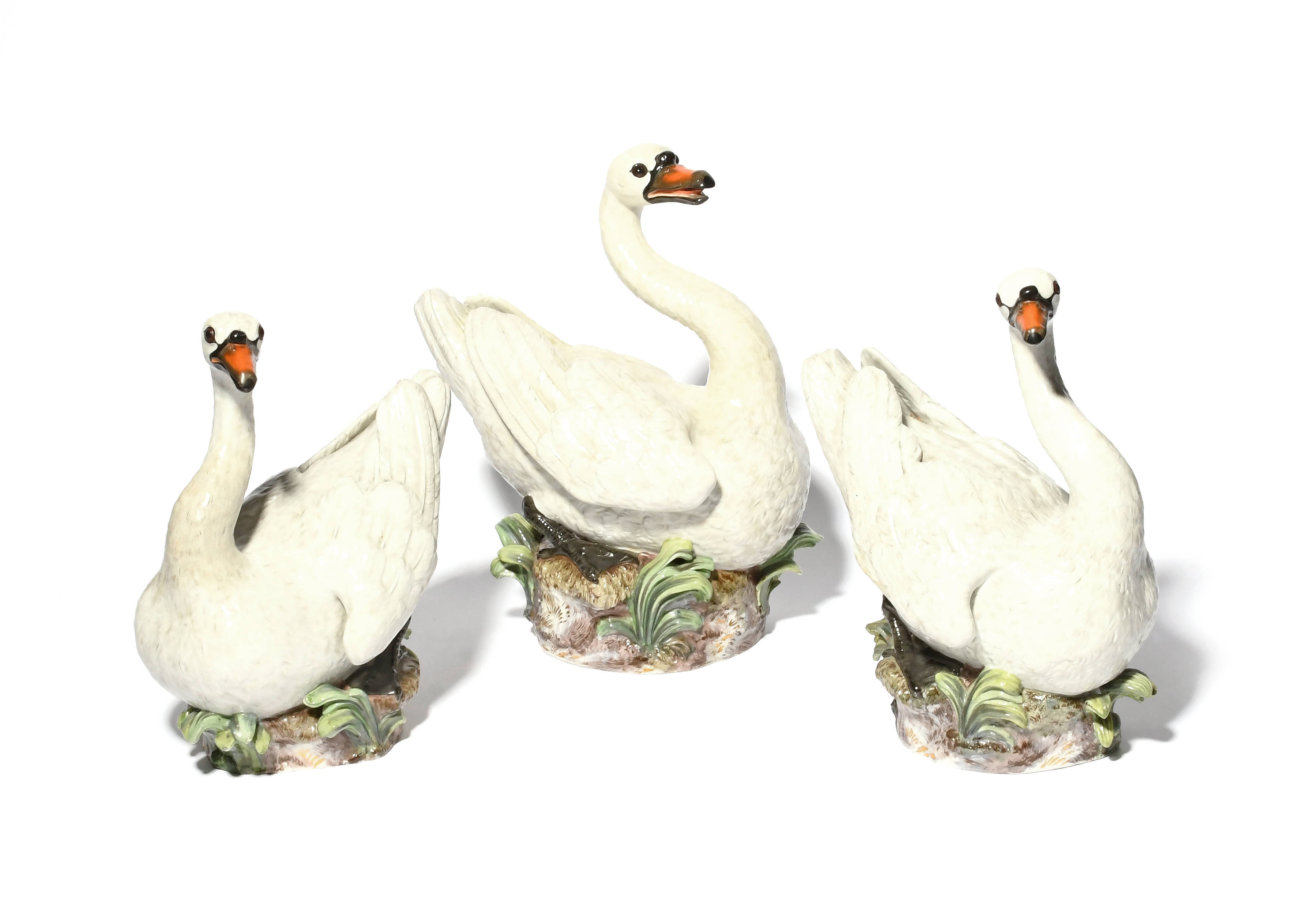 A large pair of Meissen figures of swans, 19th century, after the models by J J Kändler, modelled with wings closed and an elegant curve to their necks, raised on rocky bases with reeds, and a third larger group of the same model, blue crossed swords marks, incised 1046, 1060 and 1054, some restoration, 32cm max. (3)