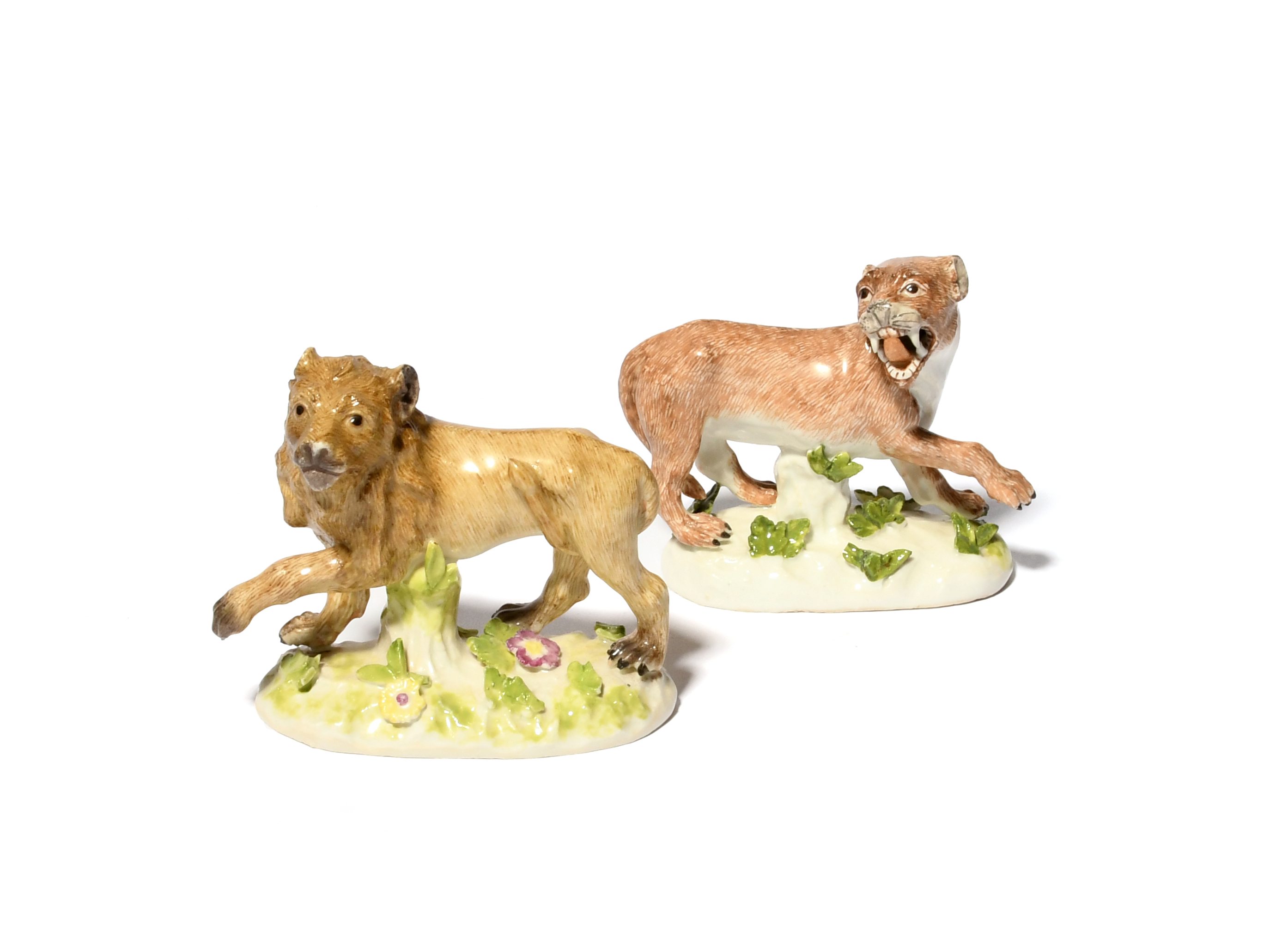 A matched pair of Meissen figures of a lion and lioness, c.1760-70, each modelled with head turned and one forepaw outstretched, raised on low oval bases applied with flowers and leaves, the lioness baring her teeth, blue crossed swords marks, 7.8cm high max. (2)