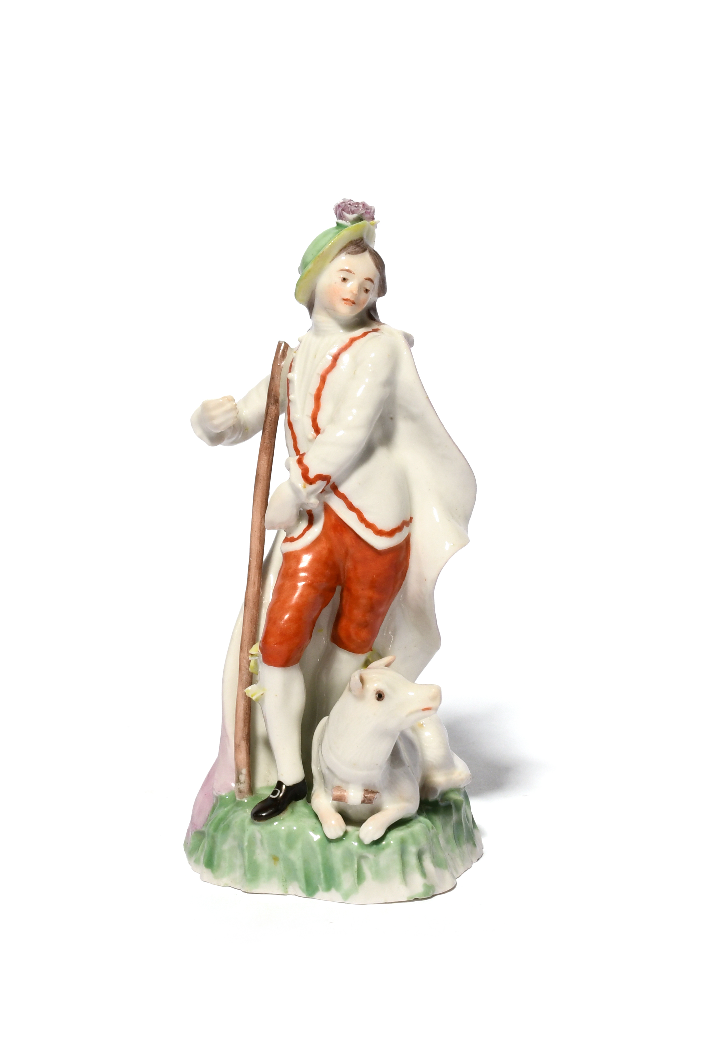A Volkstedt figure of a shepherd, c.1770-80, wearing a long lilac cloak and ribboned breeches, a