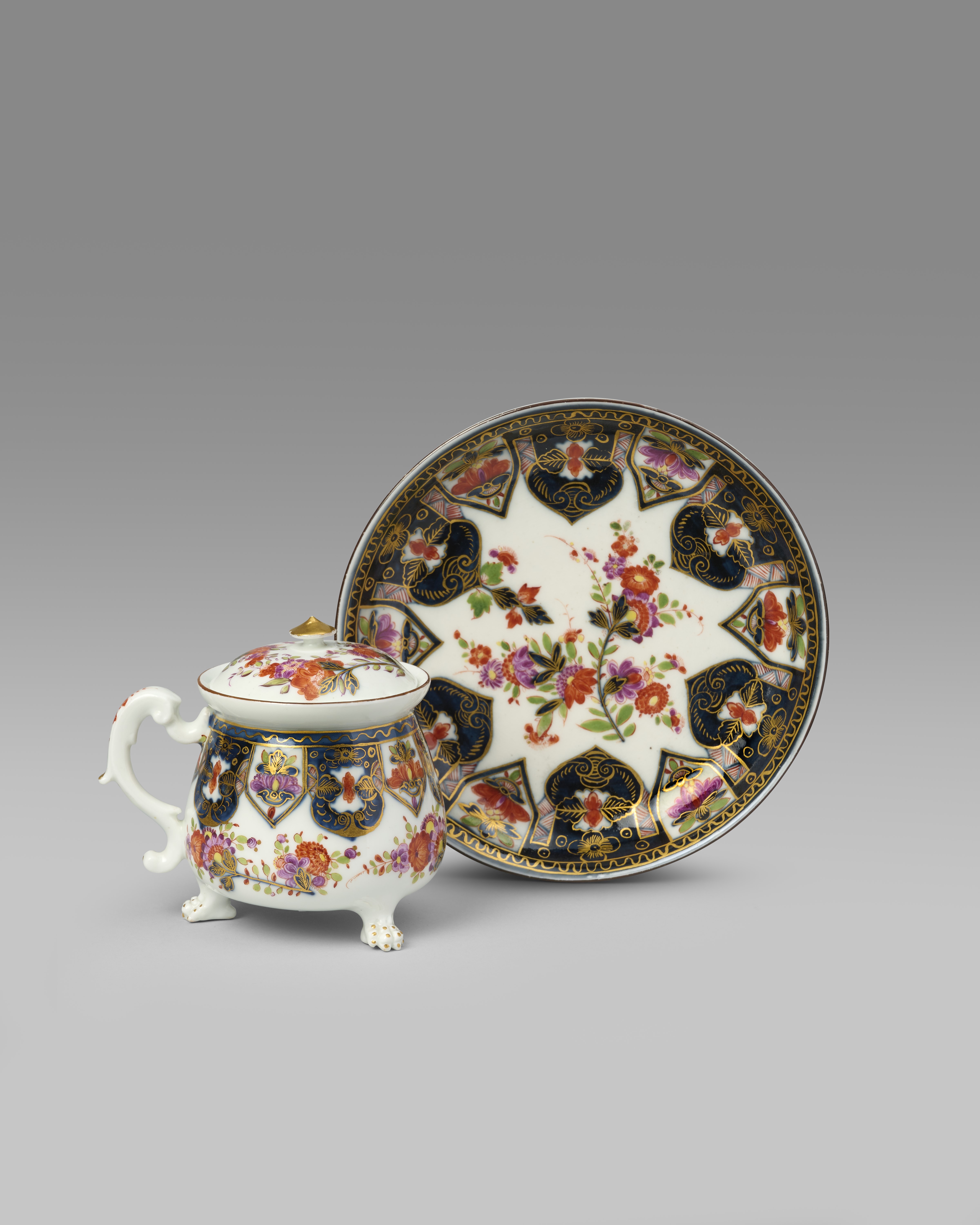A rare and early Meissen cream pot with cover and stand, c.1730-35, painted in the Imari palette with sprays of indianische Blumen within a lambrequin panelled border, blue caduceus mark, painter's mark of four red dots inside the footrim, 16.8cm. (3)