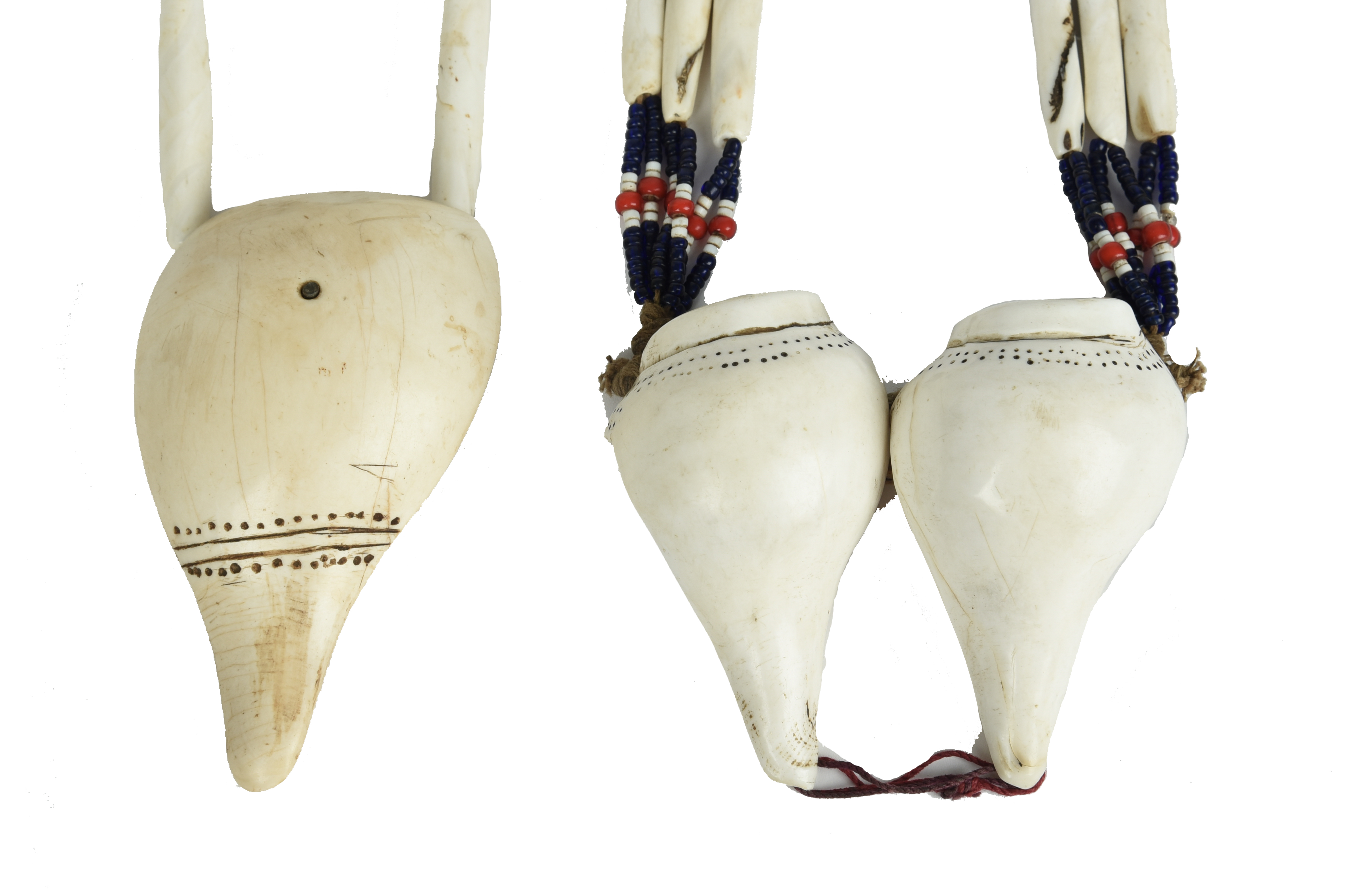 one with a single carved chank shell, with incised dot and linear decoration, with blue glass, shell and carnelian beads, 44.5cm long, and the other with a double shell pendant, having incised dot decoration and with a bound bone support to the back and with coloured glass and shells beads, 34cm long. (2)
