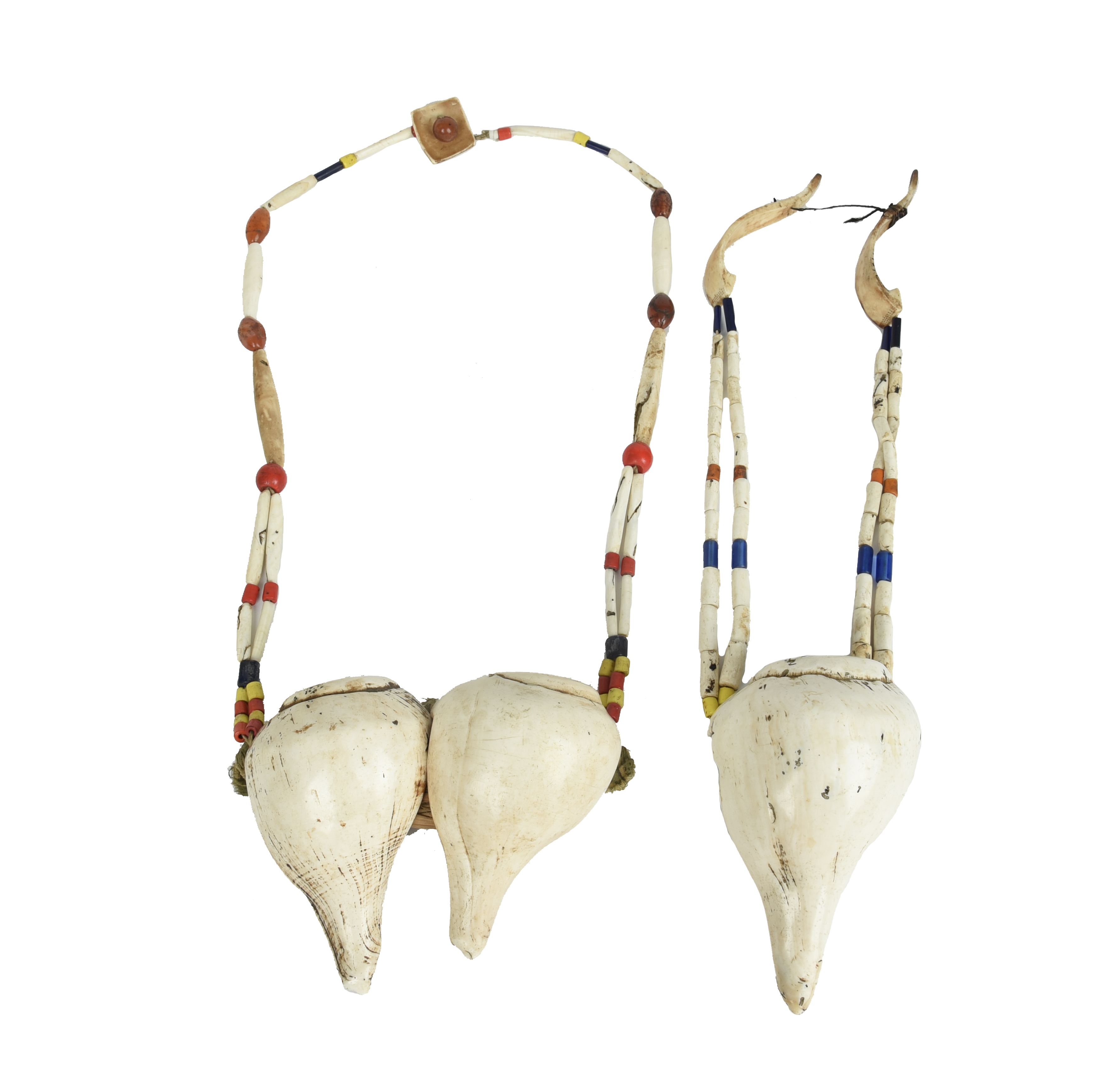 carved chank shells, coloured glass, shell and carnelian beads, the double shell pendant with a fabric bound bone support, 67cm long, the other with two shell slithers with incised dot decoration, one with a brass wire repair, 56cm long. (2)
