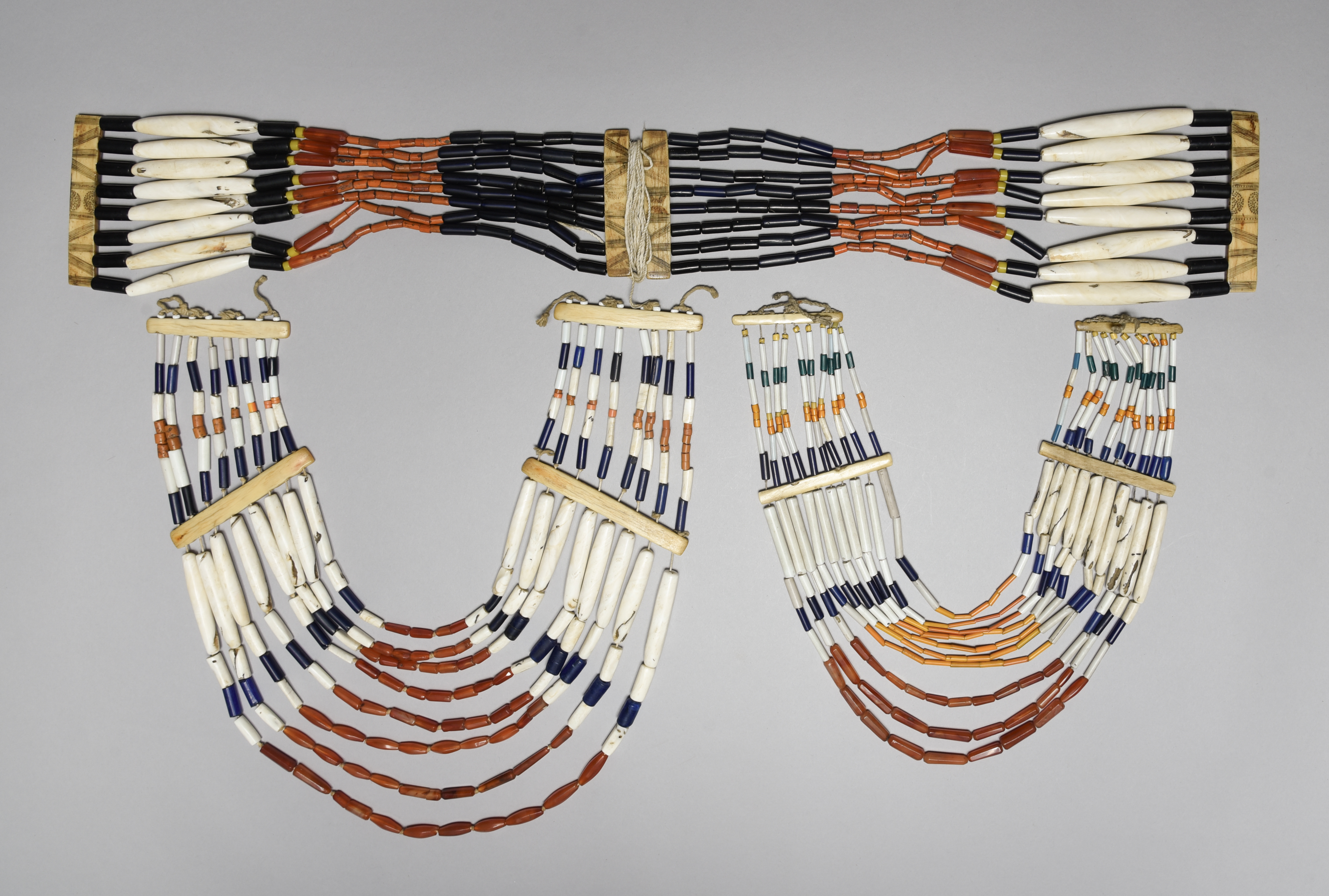 shell, coloured glass and carnelian beads, with fibre and bone, the belt spacers with incised linear and dot decoration,